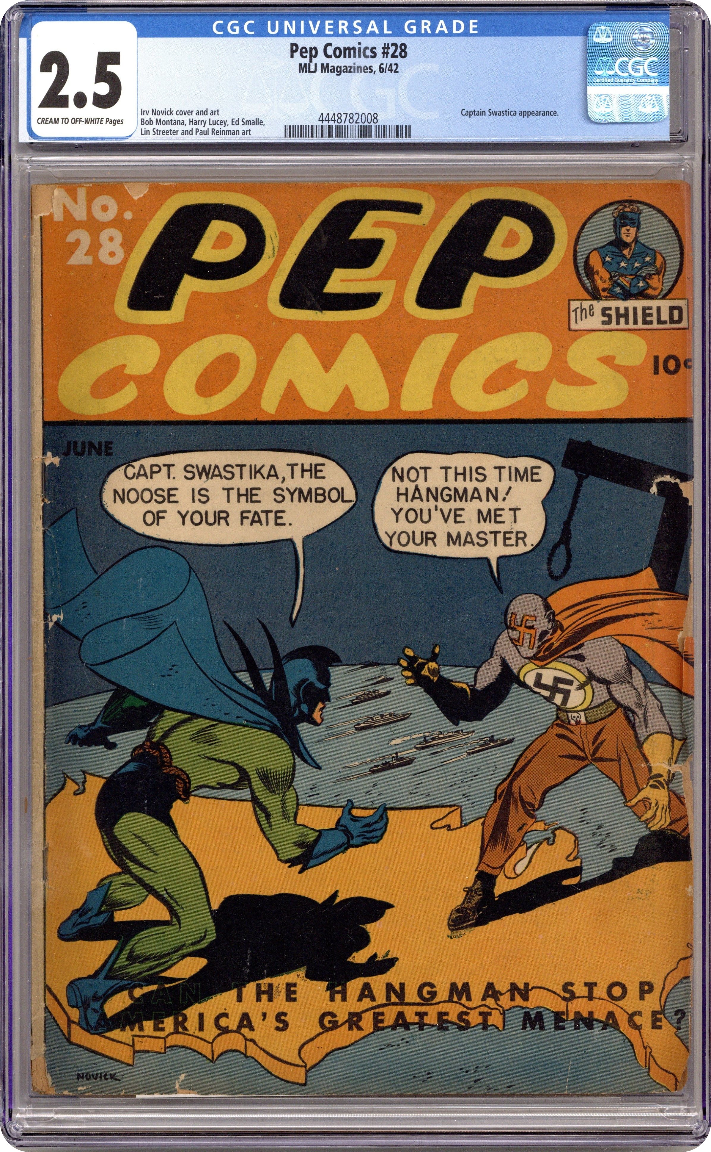 Cover art by Irv Novick. Shield story, art by Irv Novick. Hangman story, art by Harry Lucey. Danny In Wonderland story, script by Harry Shorten, art by Lin Streeter. Sergeant Boyle story, art by Carl Hubbell. Archie On Vacation starring Archie Andrews, script and art by Bob Montana. Bentley of Scotland Yard, script by Joe Blair, art by Paul Reinman. Young Soldiers of America starring Shield, script by Harry Shorten, art by Irv Novick. 68 pgs. $0.10. Cover price $0.10.