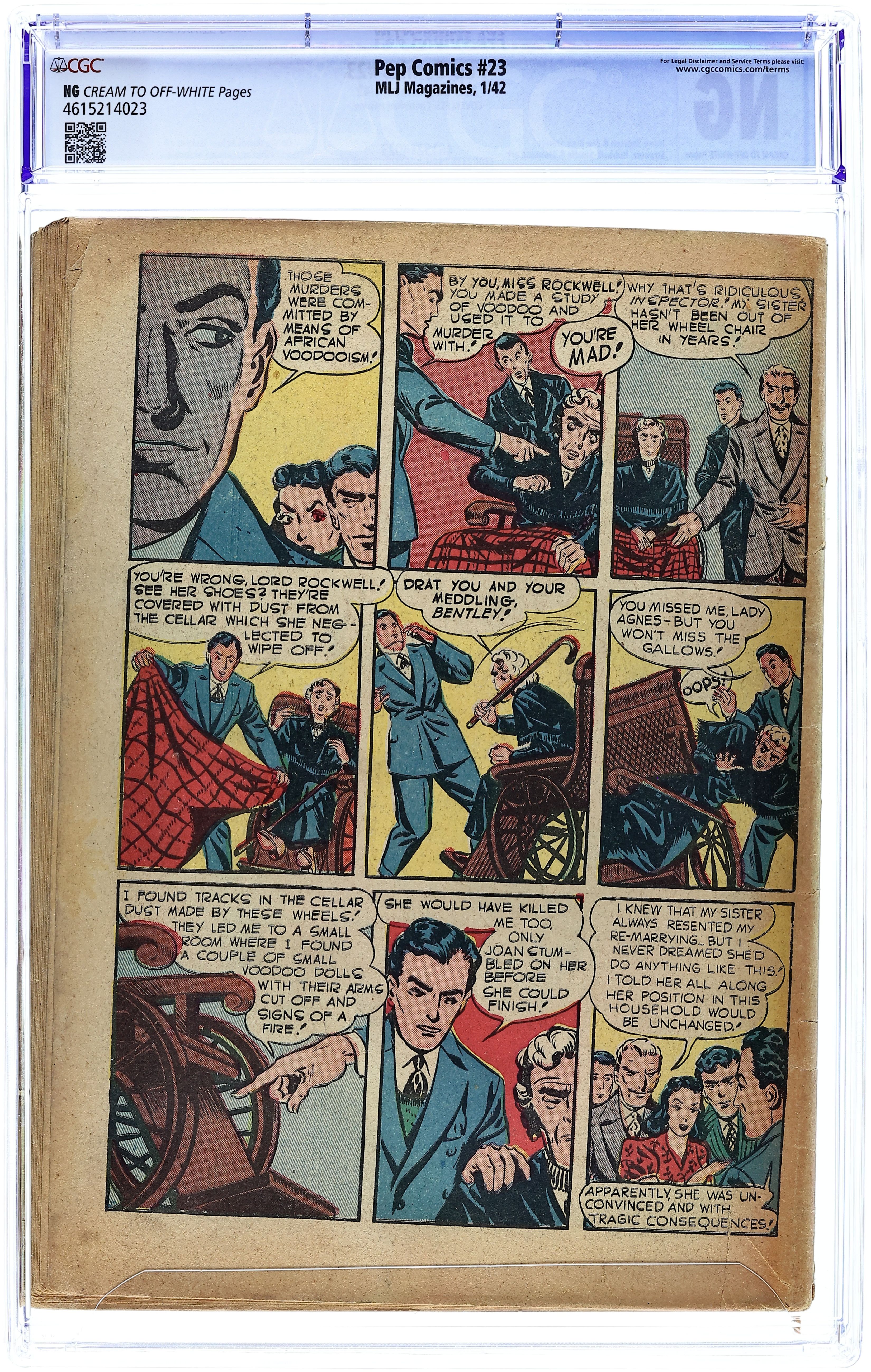 Cover art by Bob Fujitani. Untitled Shield story, art by Irv Novick; A cheap, gaudy rug turns up at several murders. Harry Shorten bio by Scott Feldman. "Sabotage!" starring Hangman, art by Bob Fujitani; An organizes band of saboteurs operates on American oil fields in Mexico. "Murder Makes a Phone Call" text story starring The Hangman by Scott Feldman. Untitled Danny In Wonderland story by Harry Shorten, art by Red Holmdale; The Swedish mystic plays magical tricks on Kuppie. Untitled Sergeant Boyle story by Harry Shorten, art by Carl Hubbell; Collins is carrying a case of nitroglycerine on a plane bound for the front in Africa. Untitled story, art by Red Holmdale; Archie spends $100, thinking he won a limerick contest; He gets into hot water when Jughead tells him it was a gag. Untitled Bentley of Scotland Yard story, art by Paul Reinman; There were four things...a death by lightning, a steam shovel, an unreported flight plan, and a piece of wire...four things that didn't add up. 68 pgs., full color. Cover price $0.10.