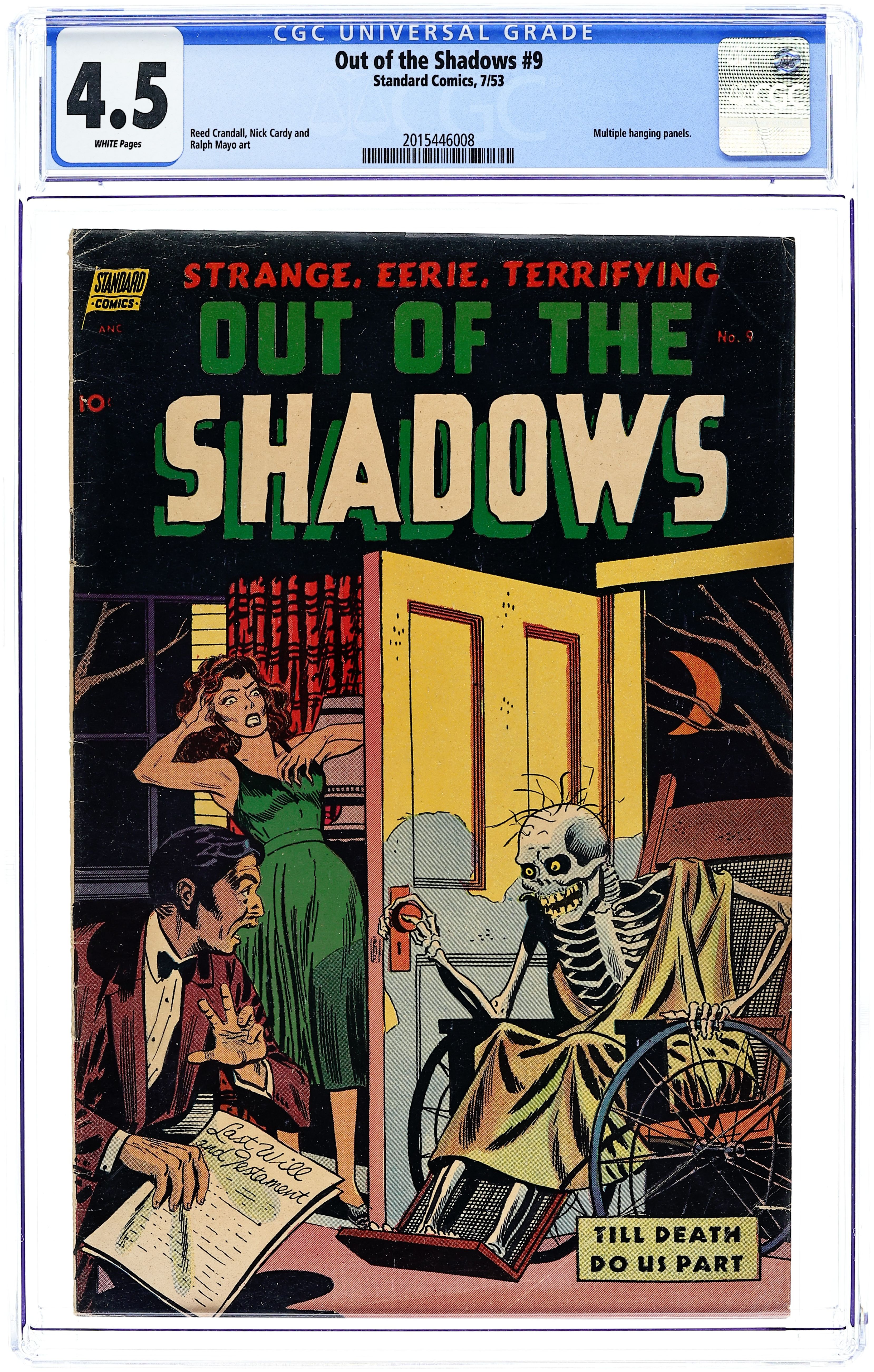 The Corpse That Came to Dinner, pencils by Reed Crandall, inks by Mike Peppe; A young couple returns from their honeymoon; They learn that a friend has committed suicide, because he had wanted to marry the girl; The friend's corpse climbs out of his grave and lays siege to the couple's apartment. The Horror of Candle Lodge, art by Nick Cardy; Ghost of US-American freedom fighter slays the descendants of British soldiers who lured him into a trap. Till Death Do Us Part, pencils by Nick Cardy; Charles finds out that her sister's husband is keeping him from his inheritance by pretending the sister still to be alive. High Hung the Witch text story by John Marvin. Gunnvor the Sorceress, art by Ralph Mayo; Account of Icelandic saga about madwoman Gunnvor, who could not be killed and haunted her people in many different shapes. Hanged by the Neck, art by Reed Crandall; The magician El Rondo grows jealous of his assistant and hangs him on stage (during a magic routine). 36 pages, full color. Cover price $0.10.