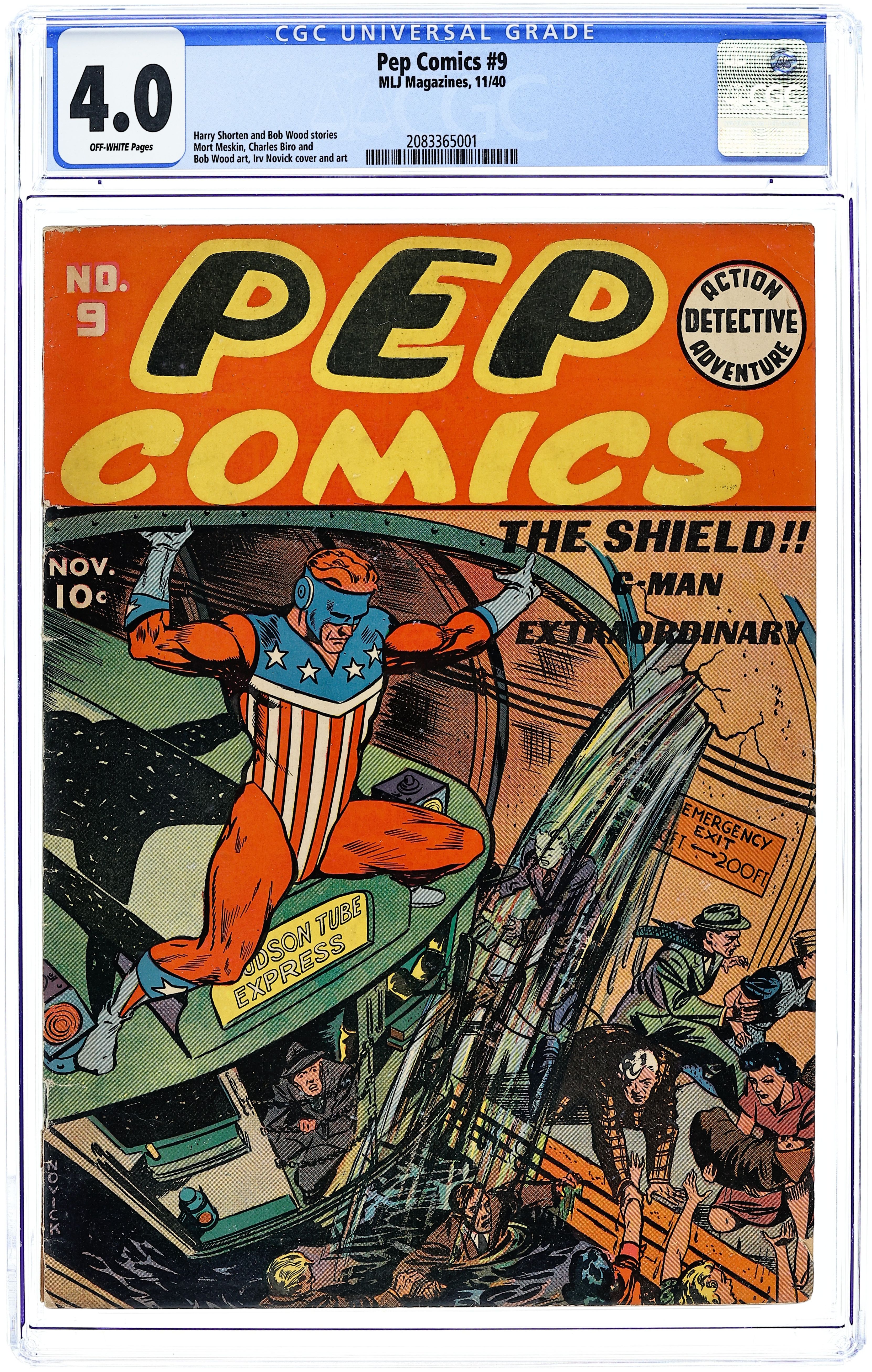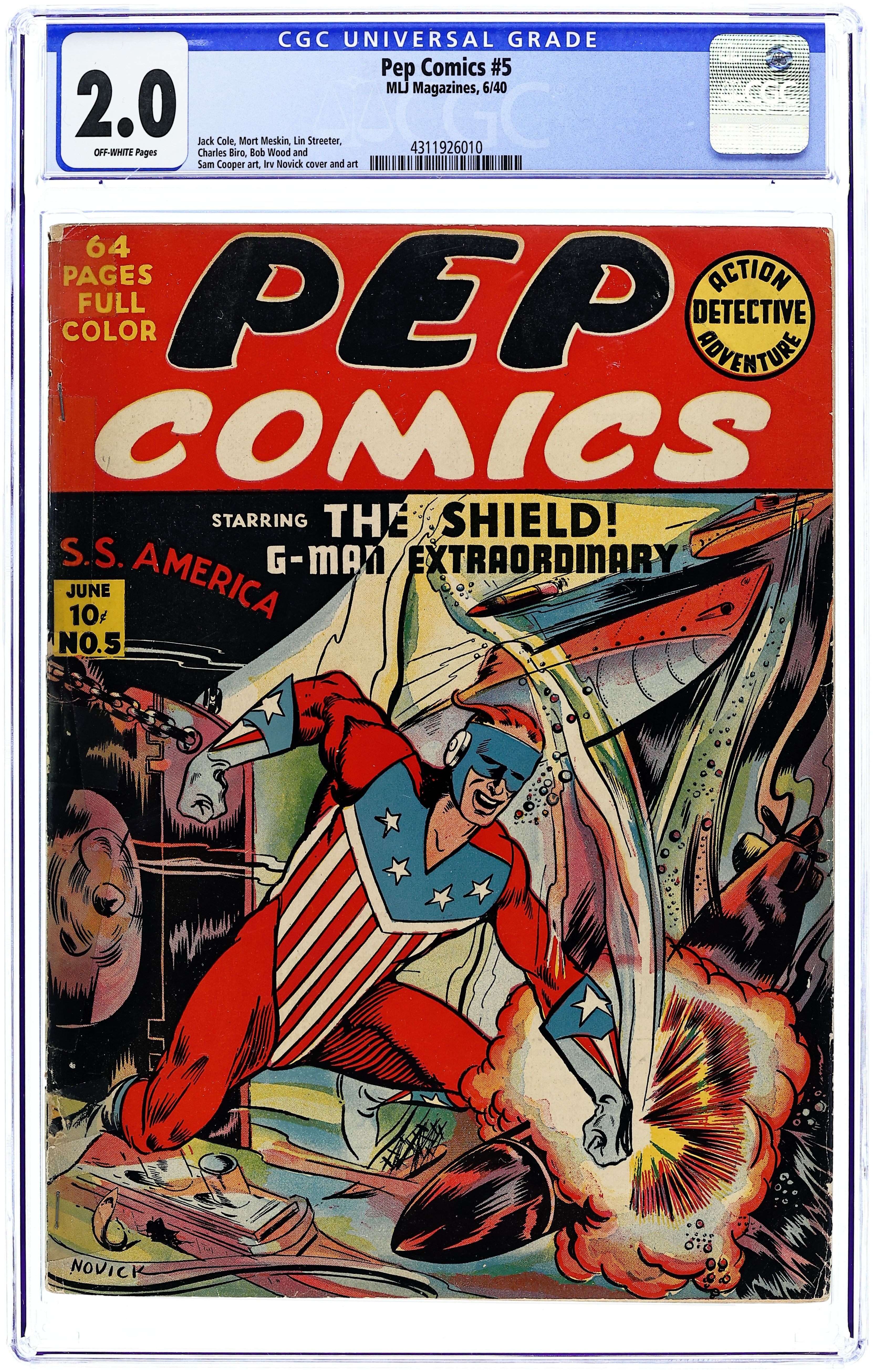 Cover art by Irv Novick. Shield story, script by Harry Shorten, art by Irv Novick. Hangman story. Danny In Wonderland story, script by Harry Shorten, art by Lin Streeter. Sergeant Boyle story, art by Carl Hubbell. Jolly Roger story, script by Joe Blair, art by Ed Smalle. Archie Andrews story, art by Bob Montana. Kayo Ward story, script by Harry Shorten. The Case of the Armless Corpses starring Bentley of Scotland Yard, script by Joe Blair. 68 pgs. $0.10. Cover price $0.10.