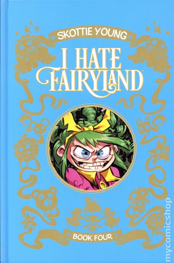 Volume 4 - 1st printing. Collects I Hate Fairyland (2022 Image) #11-20. Story and art by Skottie Young. SKOTTIE YOUNG—the New York Times bestselling and Eisner Award-winning writer of AINT NO GRAVE, TWIG, MIDDLEWEST, and many more—brings you another heaping helping of fairy tale violence. In this oversized deluxe hardcover collection with art by Brett Bean (MARVELS ROCKET AND GROOT), Gert wanders around Fairyland sticking her axe where it doesnt belong on adventure after bloody adventure! Ultimately leading to a confrontation with a long-lost foe, who has raised an army of the dead to put Gert down once and for all… Hardcover, 7 1/2-in. x 11 1/2-in., 336 pages, full color. Mature Readers Cover price $34.99.