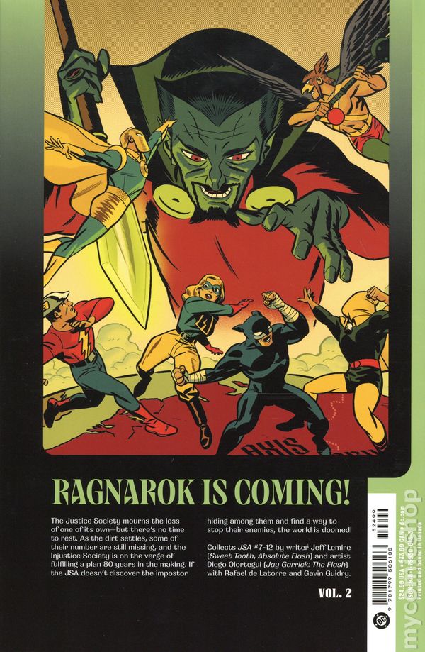 Volume 2 - 1st printing. "Ragnarok!" Collects JSA (2024 DC) #7-12. Written by Jeff Lemire. Art by Diego Olortegui, Rafael De Latorre, and Gavin Guidry. Cover by Leonardo Romero. Back Cover by Michael Cho. THE JSA IN MOURNING! The Justice Society mourns the loss of one of its own--but theres no time to rest. As the dust settles, some of their numbers are still missing, and the Injustice Society is on the verge of fulfilling a plan 80 years in the making. If the JSA doesnt discover the impostor hiding among them and find a way to stop their enemies, the world is doomed! Collects JSA #7-12 by writer Jeff Lemire (Sweet Tooth, Absolute Flash) and artist Diego Olortegui (Jay Garrick: The Flash). Softcover, 144 pages, full color. Teen Cover price $17.99.