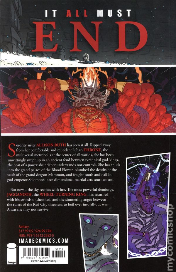 Volume 5 - 1st printing. "Breaker of Infinities!" Story and art by Tom Parkinson-Morgan. Sorority sister Allison Ruth has seen it all. Ripped away from her comfortable and mundane life to Throne, the multiversal metropolis at the center of all worlds, she has been unwittingly swept up in an ancient feud between tyrannical god-kings, the host of a power she neither understands nor controls. She has broken into the grand palace of the Blood Flower, plunged the depths of the vault of the grand dragon Mammon, and fought tooth and nail in god-emperor Solomon's inter dimensional martial arts tournament. But now the sky seethes with fire. The most powerful demiurge, Jagganoth, the Wheel Turning King, has returned with his swords unsheathed, and the simmering anger between the rulers of the Red City threatens to boil over into all out war. A war she may not survive. Softcover, 7 1/2-in X 10-in., 192 pages, full color. Cover price $17.99.