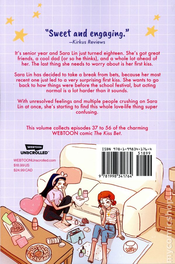 Volume 3 - 1st printing. Story and art by Ingrid Ochoa. In this adorable coming-of-age comic for fans of This One Summer by Mariko Tamaki and Jillian Tamaki and Rainbow Rowells Pumpkinheads, Sara Lin has decided now is the time: shes going to make her first kiss, something special and magical, happen. Its senior year and Sara Lin just turned eighteen. Shes got great friends, a cool dad (or so he thinks), and a whole lot ahead of her. The last thing she needs to worry about is her first kiss. But thats all about to change because her good pal Patrick just challenged her to a bet that will either lead to love, heartbreak, or embarrassment . . . or maybe all three. Along the way, as Sara explores her relationship options with three different boys, she discovers life isn't a fairytale and romance is inherently complex. It's messy and complicated, but boy, it sure can be fun. Sara Lin has decided to take a break from bets, because her most recent one just led to a very surprising first kiss. She wants to go back to how things were before the school festival, but acting normal is a lot harder than it sounds. With a lot of unresolved feelings and multiple people crushing on Sara Lin at once, shes starting to find this whole love life thing super confusing. This volume collects episodes 37 to 56 of the charming WEBTOON comic The Kiss Bet. Softcover, 6-in.x 9-in., 288 pages, full color. Teens Cover price $18.99.
