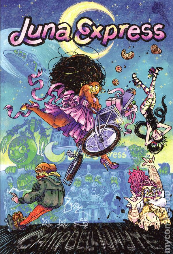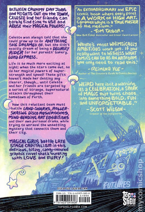 1st printing. Story and art by Campbell Whyte. Between crummy day jobs and nights out on the town, Celeste and her friends can barely find time to use their super-powers! Sailor Moon meets late capitalism in this deliriously epic graphic novel, bursting with life and vibrant color. Celeste was always told that she could grow up to do anything she dreamed of, but she didn't exactly dream of being a delivery biker for her parents bakery, Luna Express. Life is so much more exciting at night: When the stars come out, so do her magical powers of super-strength and speed! Those gifts haven't made her destiny any clearer, though…until Celeste and her friends are targeted by a series of strange, supernatural attacks throughout their hometown of Perth. Now this reluctant team must battle land-sharks, roller-skating disco mushrooms, mind-bending art exhibitions, and their own personal drama, while trying to unravel the unsettling mystery that connects them and their city. Softcover, 280 pages, full color. Teen Cover price $19.99.