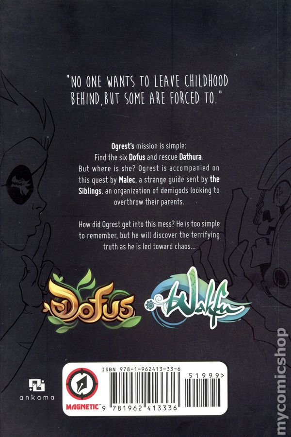 Volume 4 - 1st printing. Story and art by Mig. Set within the video-game universe of Wakfu, the popular online role-playing game and animated series on Netflix! Ogrest's mission is simple: Find the six fabled Dofus artifacts for Dathura so she can become human. His love and devotion for her knows no bounds. He is joined on this quest by Malec, a strange guide sent by the Siblings. How did he end up in this mess? He doesn't remember . . . but he'll discover the terrifying truth as his path leads toward chaos . . . Softcover, 6-in. x 9-in., 192 pages, B&W. Teen+ Cover price $19.99.