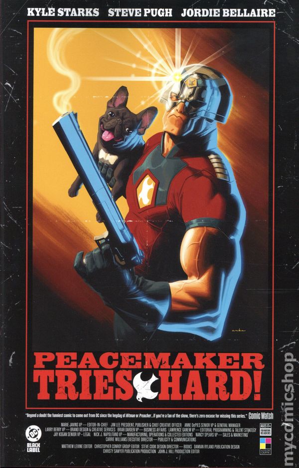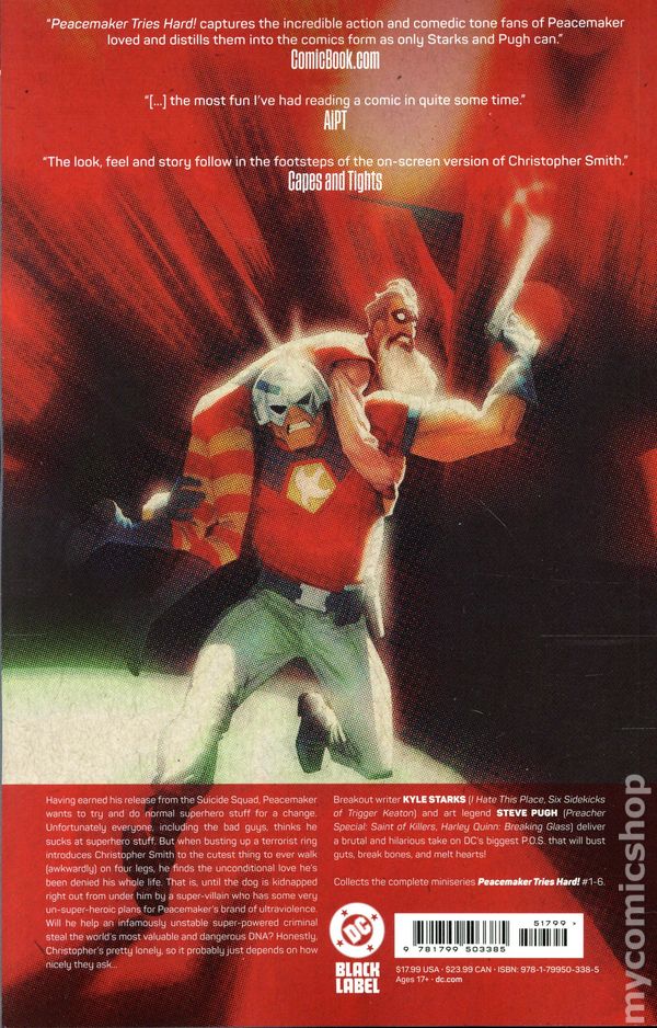 1st printing. Collects Peacemaker Tries Hard (2023 DC) #1-6. Written by Kyle Starks. Art by Steve Pugh. Cover by Kris Anka. Having earned his release from the Suicide Squad, Peacemaker wants to try to do normal superhero stuff for a change. Unfortunately everyone, including the bad guys, thinks he sucks at superhero stuff. But when busting up a terrorist ring introduces Christopher Smith to the cutest puppy to ever walk (awkwardly) on four legs, he finds the unconditional love he's been de¬nied his whole life...until the dog is kidnapped by a super-villain with some very un-super-heroic plans for Peacemaker's brand of ultraviolence. Will he help an unstable criminal steal the world's most valuable--and dangerous-- DNA? Honestly, Christopher's pretty lonely, so it probably just depends on how nicely they ask... Softcover, 160 pages, full color. Mature Readers Cover price $17.99.
