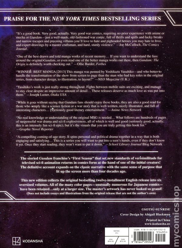 Volume 4 - 1st printing. Original Story by Yoshiyuki Tomino and Hajime Yatate. Mechanical Design by Kunio Okawara. The classic Gundam series now in a premium Deluxe Edition hardcover! PRAISE FOR THE NEW YORK TIMES BESTSELLING SERIES Its a good book. Very good, actually. Very good war comics, requiring no prior experience with anime or mecha or Gundam—just a well-made, old-fashioned war comic, full of thrills and spills and lucky breaks and narrow escapes and preening villains youll love to hate and pigheaded heroes you may hate to love, and expert drawings by a master craftsman, and hard, sturdy violence. —Joe McCulloch, The Comics Journal One of the best drawn and told manga works of recent memory… If you want to understand the fuss around the original Gundam, or even read one of the better manga works out there, then Gundam: The Origin is definitely worth checking out. —Ollie Barder, Forbes WINNER: BEST MANGA [2013] This manga was penned by Yoshikazu Yasuhiko—and who better to handle the transformation of the show from screen to page than the man who had key roles in the original series, from character design, to illustration, to layout? —NEO Magazine (U.K.) Yasuhikos work is just really strong throughout. Fights between mobile suits are exciting, and manage to stay clear despite an impressive amount of detail… These releases deserve as much love as was put into them.—Joseph Luster, Otaku USA While it goes without saying that Gundam fans should enjoy these books, they are also a good read for those who simply like a science fiction or a war story that is well-written, nicely illustrated, and full of interesting characters… [S]eriously good literary entertainment. —Anime News Network No real knowledge or understanding of the original MSG is needed… What follows are hundreds of pages of suspenseful war drama and sci-fi explosiveness, all of which is well and good (seriously good, actually; this is an intensely fun sci-fi epic), but its the visuals that you are truly getting this book for. —Graphic Novel Reporter A compelling coming-of-age story. It spins personal and political drama together in a way that is both engaging and satisfying… This is a series you will want to put into a teens hands, even if they dont know it yet. Once they start reading, they wont want to put it down. —School Library Journal Blog Network The storied Gundam franchises First Season that set new standards of verisimilitude for televised sci-fi animation returns in comics form at the hand of one of the initial creators! The definitive account expands on the classic narrative with the same sense of purpose that lit up the screen more than four decades ago. This new edition collects the original bestselling twelve-installment English release into six oversized volumes. All of the many color pages—unusually numerous for Japanese comics—have been retained…only at a larger size. The masters artwork has never looked so grand! (Does not include essays and illustrations from the original release that are not the authors own) Hardcover, 7 3/4-in. x 10 1/4-in., 904 pages, B&W. NOTE: Does not include essays and illustrations from the original release that are not the authors own. Cover price $54.95.