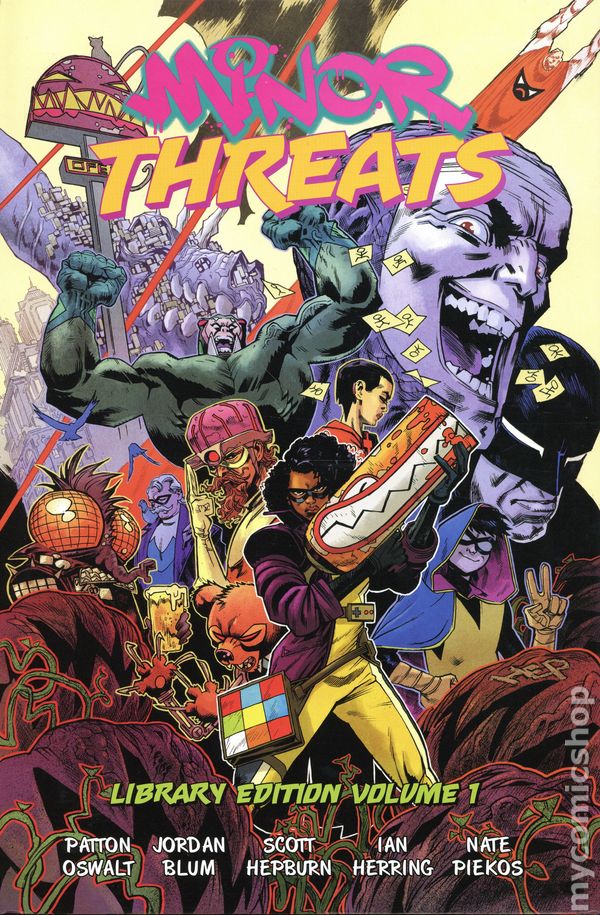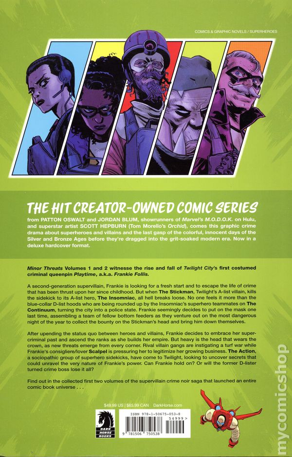 1st printing. Collects Minor Threats (2022 Dark Horse) #1-4 and Minor Threats: The Fastest Way Down (2024 Dark Horse) #1-4. Written by Patton Oswalt and Jordan Blum. Art and Cover by Scott Hepburn. The hit creator-owned comics series from Patton Oswalt and Jordan Blum, showrunners of Marvels M.O.D.O.K. on HULU and and superstar artist Scott Hepburn (Tom Morellos Orchid), comes this graphic crime drama about superheroes and villains and the last gasp of the colorful innocent days of the silver and bronze age before theyre dragged into the grit-soaked modern era. Minor Threats is now optioned for adaptation on Netflix and this debut library edition collects the first two series in a deluxe hardcover format. Minor Threats volumes 1 and 2 witnesses the rise and fall of Twilight City's first costumed criminal queenpin Playtime a.k.a. Frankie Follis. A second-generation supervillain, Frankie is looking for a fresh start and to escape the life of crime that was thrust upon her since childhood. But when The Stickman, Twilight's A-list villain, kills the sidekick to its a-list hero, The Insomniac, all hell breaks loose. No one feels it more than the blue-collar D-list hoods who are being rounded up by the Insomniac's superhero teammates on The Continuum, turning the city into a police state. Frankie decides to seemingly put on the mask one last time, assembling a team of fellow bottomfeeders as they venture out on the most dangerous night of the year to collect the bounty on the Stickman's head and bring him down themselves. After upending the status quo between heroes and villains, Frankie decides to embrace her super criminal past and ascend the ranks as she builds her empire. But heavy is the head that wears the crown as new threats emerge from every corner. Rival villain gangs are instigating a turf war while Frankie's consigliere/lover Scalpel is pressuring her to legitimize her growing business. The Action, a sociopathic group of superhero sidekicks have come to Twilight, looking to uncover secrets that could unravel the very nature of Frankie's power. Can Frankie hold on? Or will the former D-lister turned crime boss lose it all? Find out in the collected first two volumes of the supervillain crime noir saga that launched an entire comic book universe... Hardcover, 8-in. x 12-in., 272 pages, full color. Rated T Cover price $49.99.
