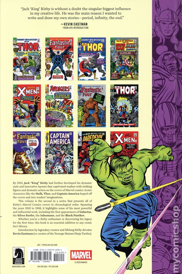 Volume 2 - 1st printing. "1965-1968!" Art and cover by Jack Kirby. Introduction by Kevin Eastman. Foreword by Vincent Iadevaia. A full-color hardcover art book collecting Jack Kirby's Marvel Comics cover art from 1965 to 1968! Jack Kirby (1917–1994) stands as one of the most iconic and influential figures in the history of comic books, with his cover work for Marvel Comics earning particular acclaim. The Marvel Comics Covers of Jack Kirby presents a chronological collection of his Marvel Comics cover art in an oversized hardcover edition. The second volume in this series showcases over 200 of Kirby's legendary covers from 1965 to 1968, including from The Avengers, Fantastic Four, Daredevil, Thor, Captain America, and The X-Men. Includes a new essay featuring original art and an introduction by Kevin Eastman. Long live the KING! Hardcover, 8-in.x 12-in., 208 pages, full color. All Ages Cover price $54.99.