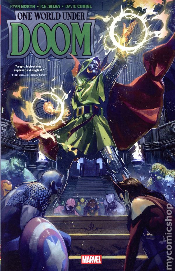 1st printing. Collects One World Under Doom (2025 Marvel) #1-9. Written by Ryan North. Art by R.B. Silva. Cover by Ben Harvey. Doctor Doom is already Earths Sorcerer Supreme — now he declares himself Emperor of the World! Six months ago, Victor Von Doom saved the world from vampires by assuming the mantle of Sorcerer Supreme — then disappeared behind Latverias closed borders. But his absence was merely the calm before the storm — a storm that has now arrived. The world wakes up to a new reality: Doom has magically taken over every broadcast medium on Earth and declared himself the ruler of the planet under the flag of a new United Latveria! And shockingly, impossibly, all global leaders seem to be going along with it. Luckily, whether its mind control or Doombots, whatevers affecting them hasnt affected Earths heroes — so they quickly form a strike team to stop Dooms machinations. But nothing will go as expected for the Fantastic Four, the Avengers and their allies! What happens when some begin to welcome their new Emperor with open arms, clamoring for ONE WORLD UNDER DOOM? Softcover, 224 pages, full color. Rated T+ Cover price $19.99.