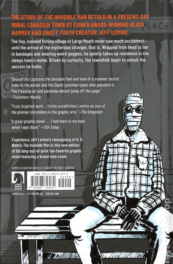 2nd Edition - 1st printing. Story and art by Jeff Lemire. The Invisible Man story retold in a present day rural Canadian town by Eisner Award-winning Black Hammer and Sweet Tooth comics creator Jeff Lemire. The tiny, isolated fishing village of Large Mouth never saw much excitement—until the arrival of the mysterious stranger, that is. Wrapped from head-to-toe in bandages and wearing weird goggles, he quietly took up residence in the sleepy town's motel. Driven by curiosity, the townsfolk begin to unlock the secrets he holds. Experience Jeff Lemires reimagining of H.G. Wells The Invisible Man in this new edition of his long out of print, fan-favorite graphic novel featuring a brand-new cover. Hardcover, 144 pages, PC. Teen Cover price $29.99.
