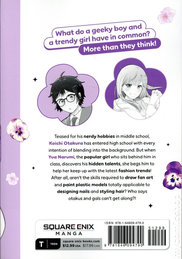 Volume 1 - 1st printing. Written by138neco. Art and cover by Souchu. Translated by Caleb D. Cook. What do a geeky boy and a trendy girl have in common? More than they think! Teased for his nerdy hobbies in middle school, Koichi Otakura has entered high school with every intention of blending into the background. But when Yua Narumi, the popular girl who sits behind him in class, discovers his hidden talents, she begs him to help her keep up with the latest fashion trends! After all, aren't the skills required to draw fan art and paint plastic models totally applicable to designing nails and styling hair? Who says otakus and gals cant get along?! Softcover, 5-in.x 7-in., 176 pages, B&W. Rated T Cover price $12.99.