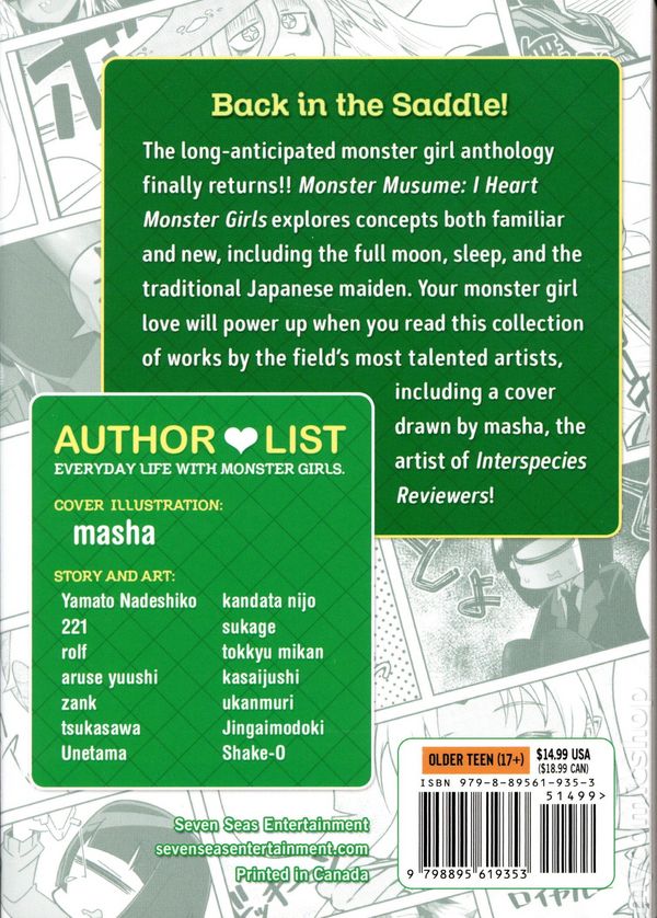 Volume 5 - 1st printing. Stories and Art by 221, coolkyousinnjya, ennorei, Tottori-saQ, kurokawa otogi, aruse yuushi, SHIRAHA MATO, stealth kaigyou, 7010, kanemaki thomas, kenkoucross, U-temo, jingaimodoki and SHAKE-O. Cover by masha. Translated by Abby Lehrke. BACK IN THE SADDLE! The long-anticipated monster girl anthology finally returns!! Monster Musume: I Heart Monster Girls explores concepts both familiar and new, including the full moon, sleep, and the traditional Japanese maiden. Your monster girl love will power up when you read this collection of works by the fields most talented artists, including a cover drawn by masha, the artist of Interspecies Reviewers! Softcover, 5-in. x 7-in., 146 pages, PC/PB&W. Older Teen (17+) Cover price $14.99.