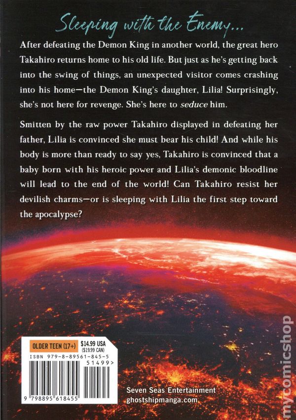 Volume 1 - 1st printing. Story and art by Shinta Sakayama. Translated by Luna Holbaum. Adapted by Patrick King. After his victory over the Demon King in another world, one man returns home to his normal life. But a visit from the late Demon Kings daughter could change everything he fought for! After defeating the Demon King in another world, the great hero Takahiro returns home to his old life. But just as he's getting back into the swing of things, an unexpected visitor comes crashing into his home—the Demon Kings daughter, Lilia! Surprisingly, she's not here for revenge. She's here to seduce him. Smitten by the raw power Takahiro displayed in defeating her father, Lilia is convinced she must bear his child! And while his body is more than ready to say yes, Takahiro is convinced that a baby born with his heroic power and Lilia's demonic bloodline will lead to the end of the world! Can Takahiro resist her devilish charms—or is sleeping with Lilia the first step toward the apocalypse? Softcover, 5-in.x 7-in., 166 pages, B&W. Older Teen (17+) Cover price $14.99.