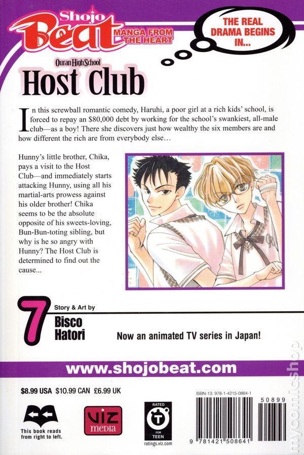 Volume 7 - 2nd and later printings. Story and art by Bisco Hatori. Hunny's little brother, Chika, pays a visit to the Host Club and immediately starts attacking Hunny, using his martial-arts prowess against his older brother! Chika seems to be the absolute opposite of his sweets-loving, Bun-Bun-toting sibling, but why is he so angry with Hunny? Softcover, 5-in. x 7-in., 192 pages, B&W. NOTE: These are Japanese manga-style GNs and are meant to be read right-to-left. Cover price $8.99.