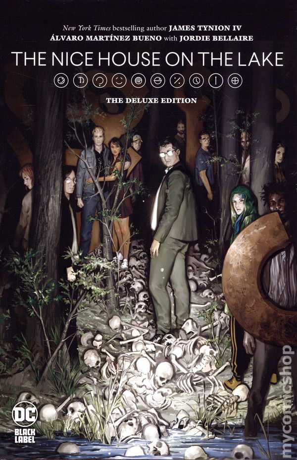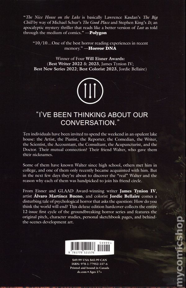 2nd and later printings. Collects The Nice House on the Lake (2021 DC) #1-12. Written by James Tynion IV. Art and cover by Alvaro Martinez Bueno. From Eisner Award-winning horror maestro James Tynion IV and his artistic collaborator Alvaro Martinez Bueno comes a tale of psychological terror that plays on the anxieties of the 21st century. Walter has always seemed a little strange. But after he invites 10 friends to a weekend getaway at a secluded house on a lake, they discover just how different he is when he reveals his true face and announces that life as they knew it will never be the same again. This deluxe edition hardcover collects the entire 12-issue first cycle and features a brand-new cover, original character outlines, and a gallery of development art and behind-the-scenes extras. Hardcover, 7 1/2-in. x 11-in., 424 pages, full color. Mature Readers Cover price $49.99.