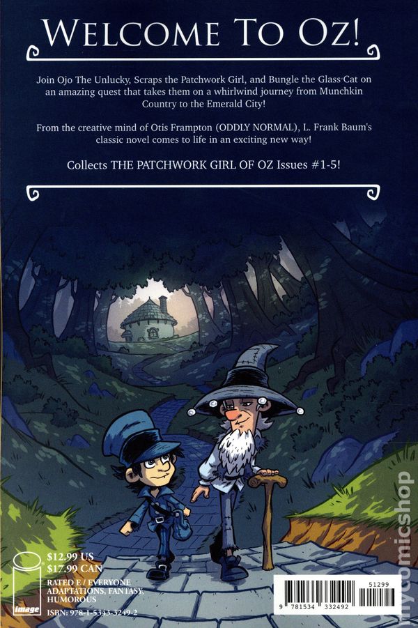 1st printing. Collects The Patchwork Girl of Oz (2025 Image) #1-5. Story and art by Otis Frampton. Journey back to L. FRANK BAUM's magical Land of Oz with THE PATCHWORK GIRL OF OZ, an imaginative new comic book adaptation for young readers from OTIS FRAMPTON, creator of ODDLY NORMAL. Join Ojo the Unlucky and his newfound friend, Scraps—the exuberant and unpredictable Patchwork Girl—on an epic quest to find the magical ingredients needed to free Ojo's uncle from a wicked spell. Along the way, they encounter an array of oddball characters, face perilous challenges, and uncover the deep mysteries of Oz! THE PATCHWORK GIRL OF OZ offers a spellbinding adventure for readers of all ages. Don't miss this extraordinary graphic novel adaptation of L. FRANK BAUMs beloved, classic children's novel that will transport you to a world where anything is possible, and every patch tells a story… Softcover, 6-in. x 9-in., 128 pages, full color. All Ages Cover price $12.99.