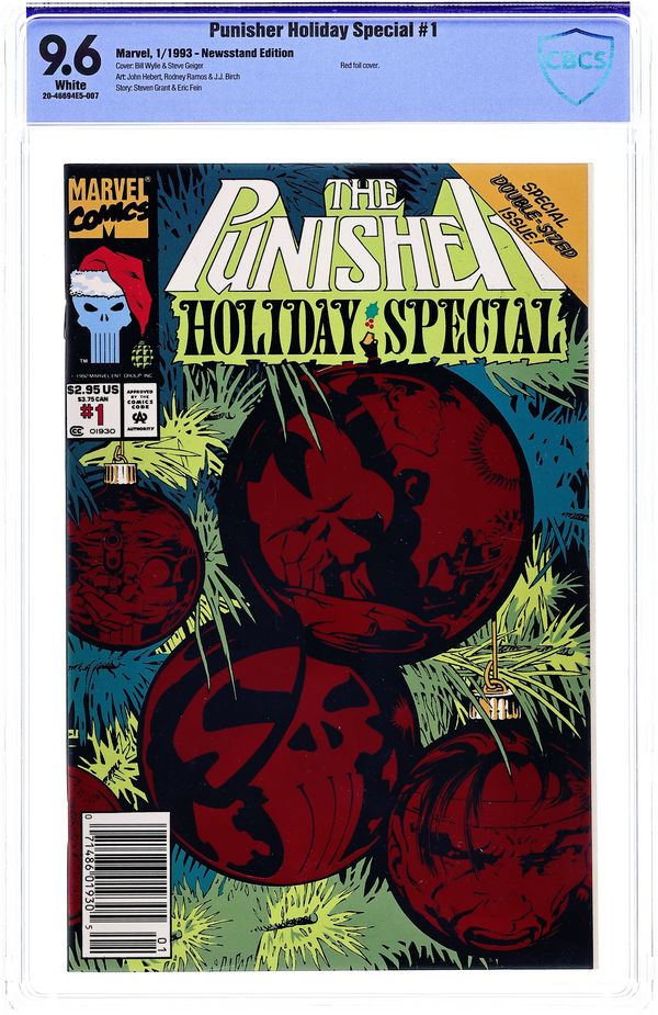 Newsstand Edition. Celebrate the Holiday season in true Punisher style with this 48-page special bearing a foil-stamped cover. A young mob capo wants revenge on the Punisher for killing his father. The number one request on his Christmas list is the Punisher's head! Written by Steven Grant. Art by John Hebert and Rodney Ramos. Plus, an 8-page backup tale by Eric Fein and J.J. Birch. Cover price $2.95.