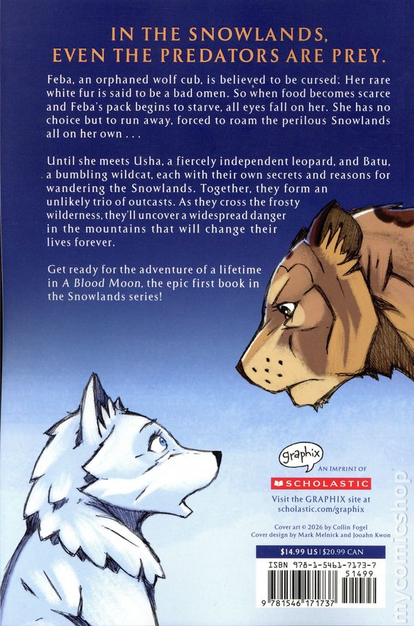 Volume 1 - 1st printing. "A Blood Moon!" Written by Morr Meroz. Art and cover by Collin Fogel. Adapted by Jim Spivey. In the heart of the Snowlands, prey and predator alike mysteriously disappear as three outcasts join forces for the adventure of a lifetime in the first book of the heart-stopping Snowlands series -- perfect for fans of Wings of Fire and Warriors! Feba, an orphaned wolf cub, is believed to be cursed. Her rare white fur is said to be a bad omen. When a mysterious creature starts killing members of Febas pack one by one, all eyes fall on her. She has no choice but to run away, forced to roam the perilous Snowlands all on her own ... Until she meets Usha, a fiercely independent leopard, and Batu, a bumbling wildcat, each with their own secrets and reasons for wandering the Snowlands. Together, they form an unlikely trio, bound by fate. As these uneasy allies cross the frosty wilderness, theyll uncover a widespread danger in the mountains that threatens to destroy everything. Get ready for the adventure of a lifetime in A Blood Moon, the epic first book in the Snowlands series! Softcover, 6-in.x 9-in., 208 pages, full color. All Ages Cover price $14.99.