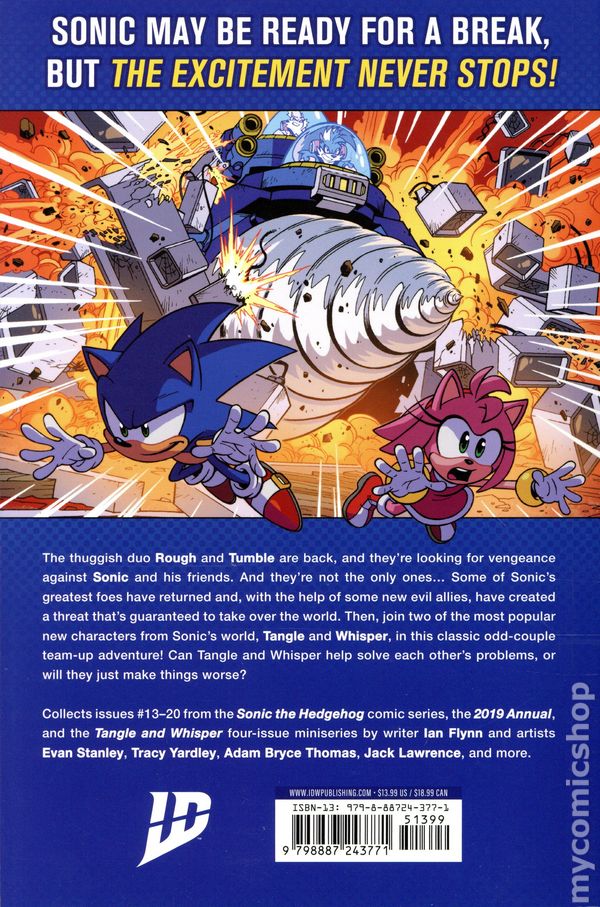 Volume 2 - 1st printing. Collects Sonic The Hedgehog TPB (2018- IDW) Vol. 4-6. Written by Ian Flynn, Caleb Goellner, Evan Stanley, Gigi Dutreix, Cavan Scott, and James Kochalka. Art by Adam Bryce Thomas, Tracy Yardley, Jack Lawrence, Diana Skelly, Jennifer Hernandez, Evan Stanley, and Jonathan Gray. Cover by Jack Lawrence. Sonic may be ready for a break, but the excitement never stops in these collections of the comic series in recommended reading order! The thuggish duo Rough and Tumble are back, and theyre looking for vengeance against Sonic and his friends. And theyre not the only ones… Some of Sonics greatest foes have returned and, with the help of some new evil allies, have created a threat thats guaranteed to take over the world. Then, join two of the most popular new characters from Sonics world, Tangle and Whisper, in this classic odd-couple team-up adventure! Can Tangle and Whisper help solve each others problems, or will they just make things worse? Plus, join Sonic and some of his coolest friends in adventures that show just how wonderful Sonics world really is. Softcover, 6-in. x 9-in., 328 pages, full color. Cover price $13.99.