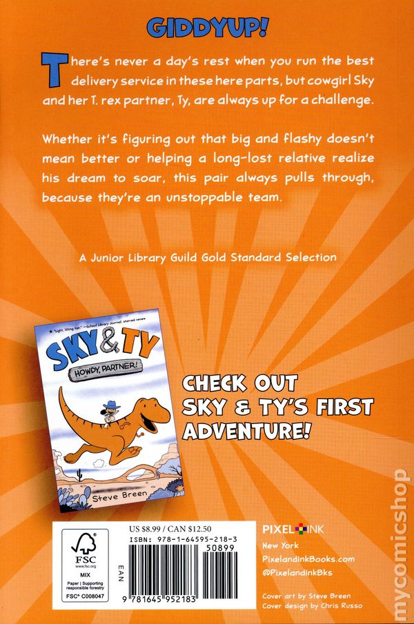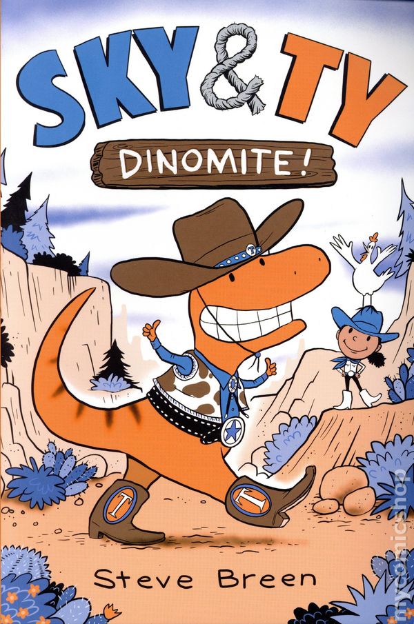Volume 2 - 1st Printing "Dinomite!" Story and art by Steve Breen. Now in paperback! Cowgirl Sky and her T. rex partner Ty return to deliver more high energy, heartfelt adventures, and laughs in this second installment of their graphic novel series from a two-time Pulitzer Prize-winner. Perfect for young chapter book graphic novel fans who love Narwhal and Jelly and Unicorn and Yeti. Theres never a days rest when you run the best delivery service in these here parts, but cowgirl Sky and her T. rex partner Ty, are always up for a challenge. Whether its helping a long-lost relative realize his dream to soar or realizing that all that glitters is not gold and big and flashy doesnt mean better, this pair always lands on the right way to pull through, because theyre an unstoppable team. The second book in this funny and warm young chapter book graphic novel series by two-time Pulitzer Prize Winner Steve Breen features two stories rendered in vibrant three-color art, interspersed with fun facts about the coolest of cowgirls and other extra content to explore. A Junior Library Guild Gold Standard Selection. Nominated to the ALAs GNCRT Best Graphic Novels for Children List. Softcover, 6-in. x 9-in. 64 pages, full color. Cover price $8.99.