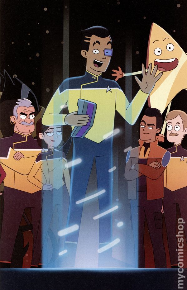 (W) Tim Sheridan (A) Vernon Smith (CA) Chris Fenoglio Just as the case of the missing Laapeerians was about to come together, the Cerritos was heavily damaged in a dogfight against an unidentified vessel and forced to return to Federation space…without the away team.Repairs on the Cerritos are bound to take weeks, but Captain Freeman and Mariner arent about to sit around and wait when they have an abandoned away team to rescue—especially one under Boimlers command.Together, they formulate a heist to steal a decommissioned starship and mount a daring rescue before their unknown assailants blast Laapoonia, and their crew members, away. 32 pages, full color, not rated. Cover price $4.99.