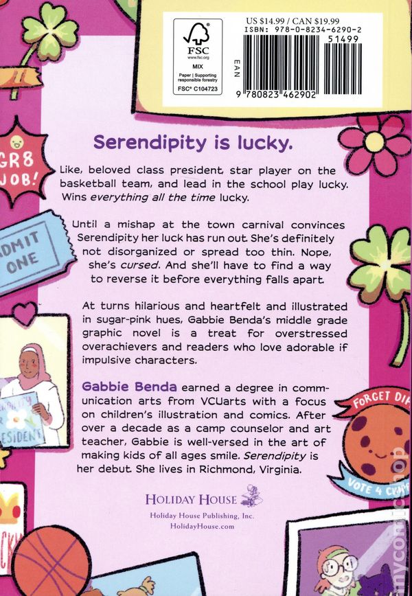 1st printing. Story and art by Gabbie Benda. Discover what happens when the luckiest kid in the world becomes extraordinarily unlucky in this funny, friendship-driven story. Serendipity is your classic overachiever. She's class president, lead in the school play, and star of the basketball team. Shes also incredibly lucky, like, wins everything all the time lucky. Until a mishap at the town carnival convinces Serendipity her luck has run out. Shes definitely not anxious, disorganized, or spread too thin. Nope, she's cursed. And she'll have to find a way to reverse it before she lets everyone down. Hilariously charming and illustrated in sugar pink hues, this graphic novel is a treat for kids who love middle school dramas and adorable, if impulsive characters. It's a perfect story for overstressed overachievers looking for a warm reminder that stepping back doesnt mean stepping down. In fact, sharing the spotlight with good friends is perhaps the luckiest thing of all. Softcover, 5 1/2-in. x 8-in., 224 pages, full color. Age 8-12 years Cover price $14.99.