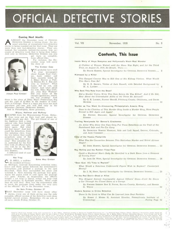 Vol. 7 #9, Nov. 1939 - "Kidnapped By a Killer", "Who Sent This Note From the Dead?", "Murder As You Want It - Uncovering Philadelphia''s Arsenic Ring" are some of the stories included in this large magazine. Green and black are the cover colors for this issue and the interior pages are also printed black and white with a green tint addition. Many period photos are used to illustrate the stories. 10.5" x 13.5", 52 pages. Cover price $0.15.