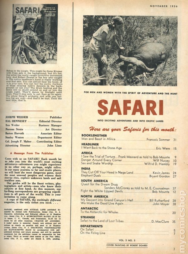 Volume 3, Issue 5 - November 1956. Cover by Robert Doares. Men's adventure magazine focusing on jungle and hunting adventures. 8 1/2-in. x 11-in., 82 pages, Text with B&W photos Cover price $0.35.