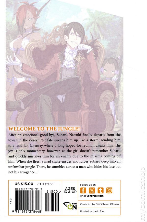 Volume 26 - 1st printing. Written by Tappei Nagatsuki. Art and cover by Shinichirou Otsuka. Translated by Dale DeLucia. After a painful goodbye, Subaru Natsuki finally manages to clear the tower in the desert. Yet fate sweeps him up like a storm, sending him to a land far, far from all his comrades where a long hoped-for reunion awaits him. The joy is only momentary, however, as the girl doesn't remember Subaru and quickly categorizes him as an enemy due to the miasma coming off him. When the girl flees, a mad chase ensues and forces Subaru deep into an unfamiliar jungle. There, he stumbles across a man who hides his face, but not his arrogance... Softcover, 5-in. x 8-in., 238 pages, Text (with B&W Chapter Illustrations). Age 13 and Up Cover price $15.00.