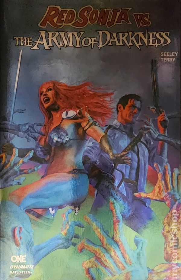 Limited 1 for 10 Retailer Incentive Variant Cover. Written by Tim Seeley. Art by Jim Terry. Cover by Tim Seeley. 'Demon bitches are my specialty.' -Ash An all-new mini-series featuring everyone's favorite, Deadite-slaying, bumbling hero - Ashely J. Williams as he sends himself (once again) back in time, to the wrong time, only this time, THIS TIME he faces Red Sonja - She-Devil with a Sword! And lurking in the shadows? Kulan Gath himself and if the most dread Wizard of the Hyborian Age gets his hands on the Necronomicon? Well sh*t, that's ain't gonna be good! 'What I've like to do here is use the Army of Darkenss dark magic stuff and infuse it into Sonja's Hyborian age, so we can do a modernized take on those earliest Thomas/Jones/Throne/Buscema comics...gritty, dark sword and sorcery, full of weird monsters and grim morality talesthe difference being that Sonja is now weighed down by Ash who is, as always, kind of a moron who ruins thingsis totally enamored with Sonja.' Seeley Featuring art by Jim Terry, our series launches with a lead cover by the red-hot Mark Spears along with Tim Seeley, Bjorn Barends and the Dynamite debut of Nikkol Jelenic! Tim [Seeley] is one of those 'slash' people…a writer-slash-artist. He has drawn a number of different comic book series including G.I JOE, HALLOWEEN, WILDCATS and EXSANGUINE. His writing work includes NY TIMES bestselling HACK/SLASH, NIGHTWING, BATMAN ETERNAL, MONEY SHOT and the critically acclaimed REVIVAL. He has also done consultation work for Cacao Barry, artist Hebru Brantley and Dreamworks Animation, and is an adjunct professor at Columbia College Chicago. He resides in Chicago, Illinois with his wife and daughter, and works at home where he is never far from his 80s action figure collection. 32 pages, full color. Rated T+ Cover price $4.99.