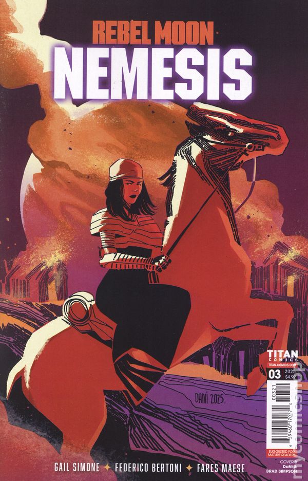 Written by Zack Snyder, Gail Simone. Art by Federico Bertoni. Cover by DaNi. COMIC BOOK PREQUEL TO THE NETFLIX MOVIE, REBEL MOON! BASED ON A STORY BY ZACK SNYDER AND WRITTEN BY AWARD WINNING COMIC CREATOR GAIL SIMONE. A brand new comic series that recounts the origins of NEMESIS! Taking place before she became the sword-wielding, cyborg assassin, this is an action-packed and badass story in the style of a revenge western, in which an innocent woman finds herself in the path of Imperium soldiers who slaughter her family... 28 pages, full color, rated mature. Cover price $4.99.