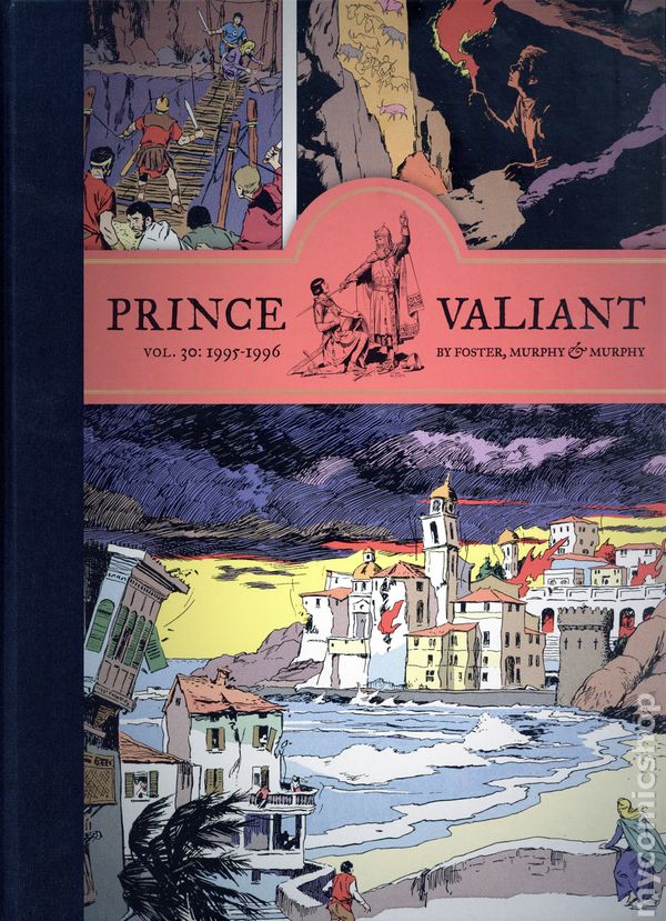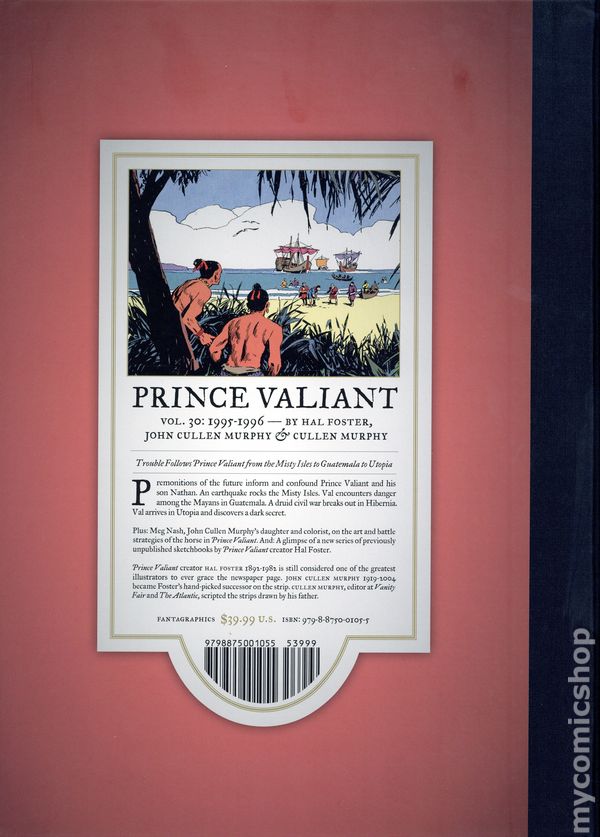 Volume 30 - 1st printing. "1995-1996!" Created by Hal Foster. Premonitions of the future inform and confound Prince Valiant and his son Nathan. An earthquake rocks the Misty Isles. Val encounters danger among the Mayans in Guatemala. A druid civil war breaks out in Hibernia. Val arrives in Utopia and discovers a dark secret. Universally acclaimed as the most stunningly gorgeous adventure comic strip of all time, Prince Valiant ran for 35 years under the virtuoso pen of its creator, Hal Foster. Starring a daring and gallant young hero, the series features epic sword fights, elaborate scenes of pomp and pageantry, and breathless plotting that always leaves the reader wanting more. Fantagraphics deluxe editions, each collecting two years worth of Sunday strips, boast superbly restored artwork that captures every delicate line and chromatic nuance of Fosters art. Hardcover, 10 1/2-in. x 14-in., 112 pages, full color. Cover price $39.99.