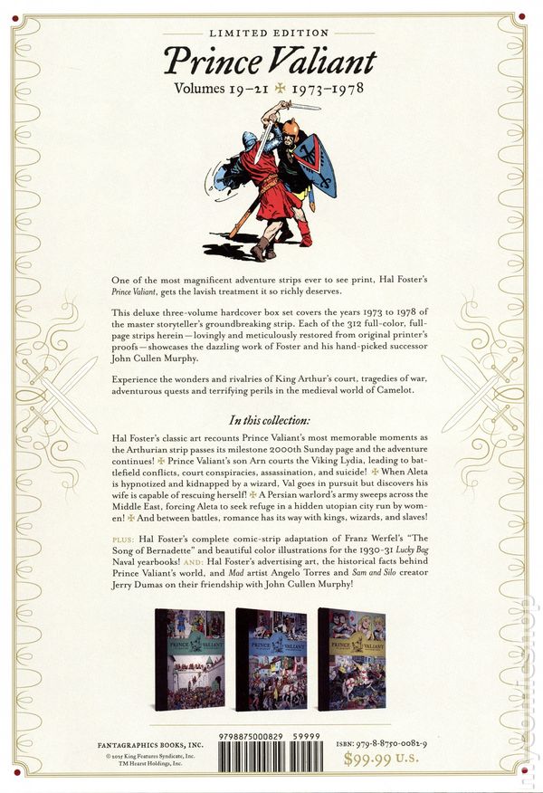 Set #7 Includes Volume 19-21 - Printings may vary. "1973-1978!" Story and art by Hal Foster. In Vol. 19, Prince Valiant is sent to defend the borders against invading barbarians, but it is young Arn who takes center stage as he travels to his homeland and loses his heart to Lydia, daughter of Haakon. In Vol. 20, Aleta defeats a wizard, then Aletas younger sister Helene is gambled away by her husband to a Corsair mercenary, drawing Val and his Singing Sword into a deadly duel. In Vol. 21, it's election time for the King of Minstrels. Arn and Court Jester Sir Dinadan travel to France to set things right, while Val accompanies the headstrong Gunther of Germany on his quest to recover stolen holy relics and claim a wife in Jerusalem. The mercenary army of a Persian warlord sweeps across the Middle East, forcing Queen Aleta to seek refuge in a hidden utopian city ruled by women. Val competes in tournaments in Marseille and Camelot and reunites with Sir Lancelot, but a tragic death impacts a member of Val's family. Also in this set: Hal Fosters complete comic-strip adaptation of Franz Werfels The Song of Bernadette and beautiful color illustrations for the 1930-31 Lucky Bag Naval yearbooks. And: The historical reality behind Prince Valiants world! Hardcover (3 Volumes with Slipcase), 10 1/2-in. x 14-in., 336 pages (Total), full color. Cover price $99.99.