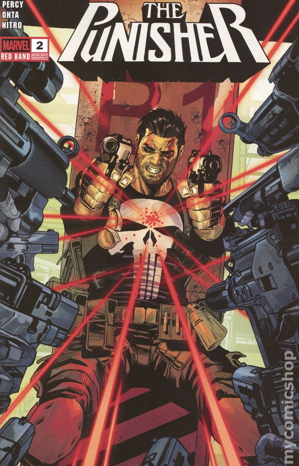2nd Printing. Written by Benjamin Percy. Art by Julius Ohta. Cover by Logo. FRANK IS BACK! Reread and reload, True Believers - Frank Castle is BACK. With no memories, a full clip and a thirst for wrathful vengeance, his violent search for answers could only be chronicled in a Red Band series! Bullets will fly, blood will flow, and the citizens and criminals of New York City alike will fear the name THE PUNISHER! From the superstar HELLVERINE creative team of Benjamin Percy and Julius Ohta, don't miss a single pulse-pounding page of this explosive new series! 32 pages, full color, rated mature. Cover price $4.99.