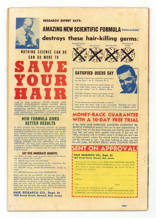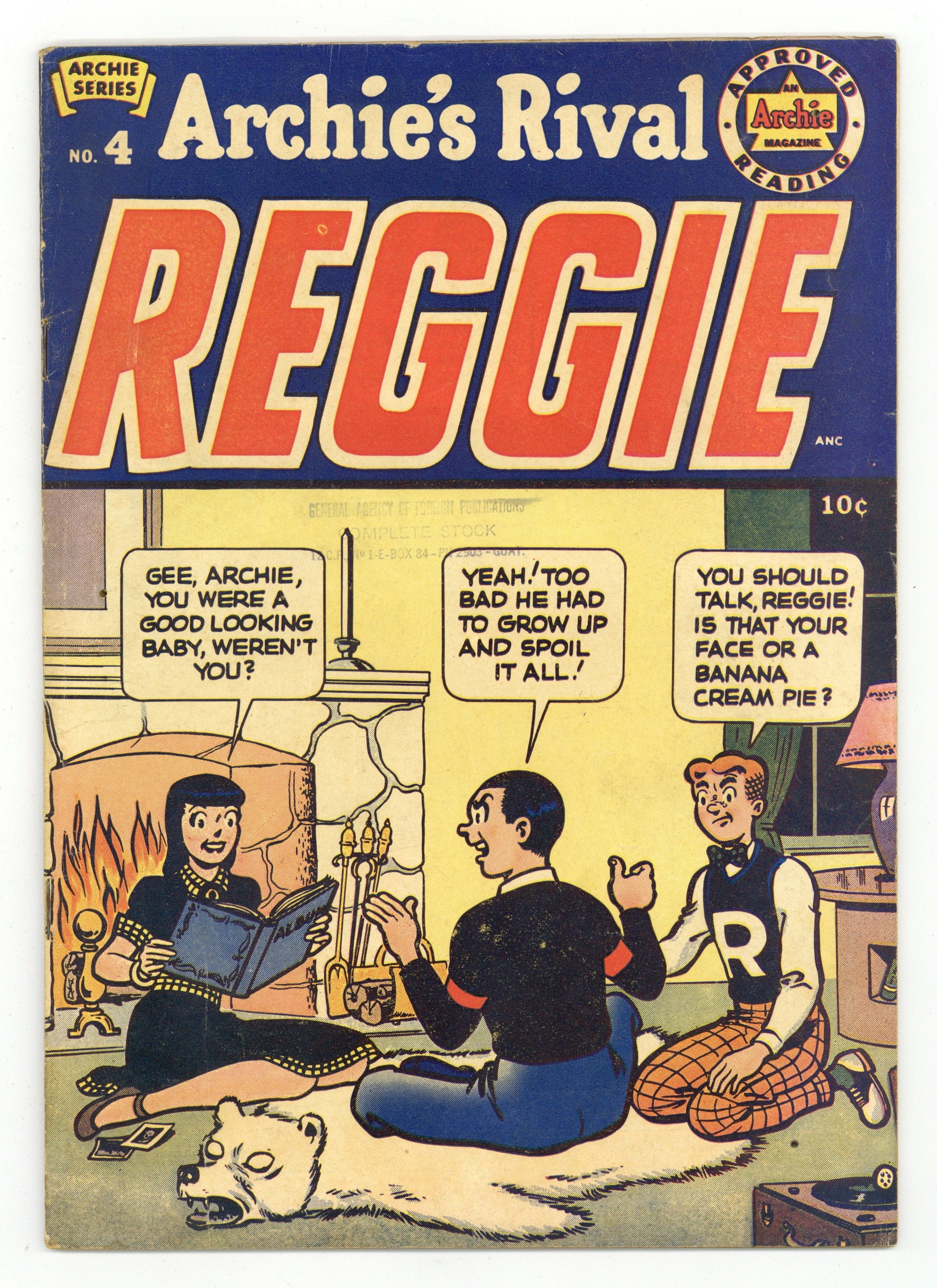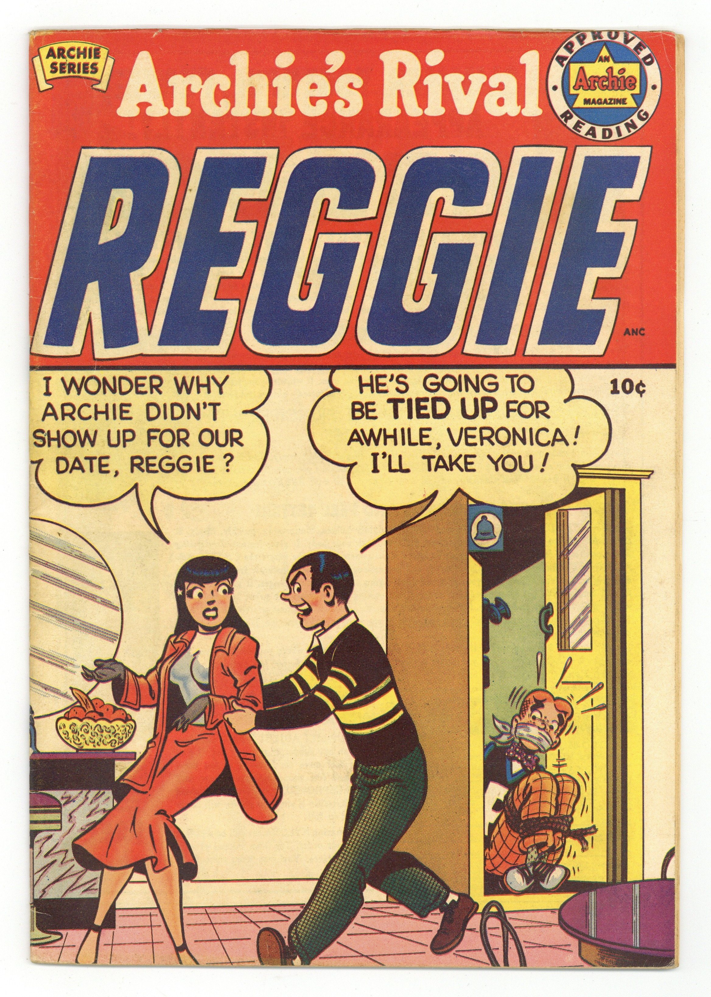 "Ferocious Fems"; Reggie coaches an all-female football team. Jughead ad. "The Hapless Hazer"; Freshman boys get even with Reggie after he hazes them. Archie Annual ad. "The Jokers"; Reggie is behind a wave of practical jokes in the school. "Screen Test"; After misunderstanding a phone call, Reggie is put to work painting screens in the Lodge Mansion while Archie feeds Veronica gum drops. "Happy Daze"; Reggie accidentally hypnotizes himself. 36 pgs., full color. Cover price $0.10.