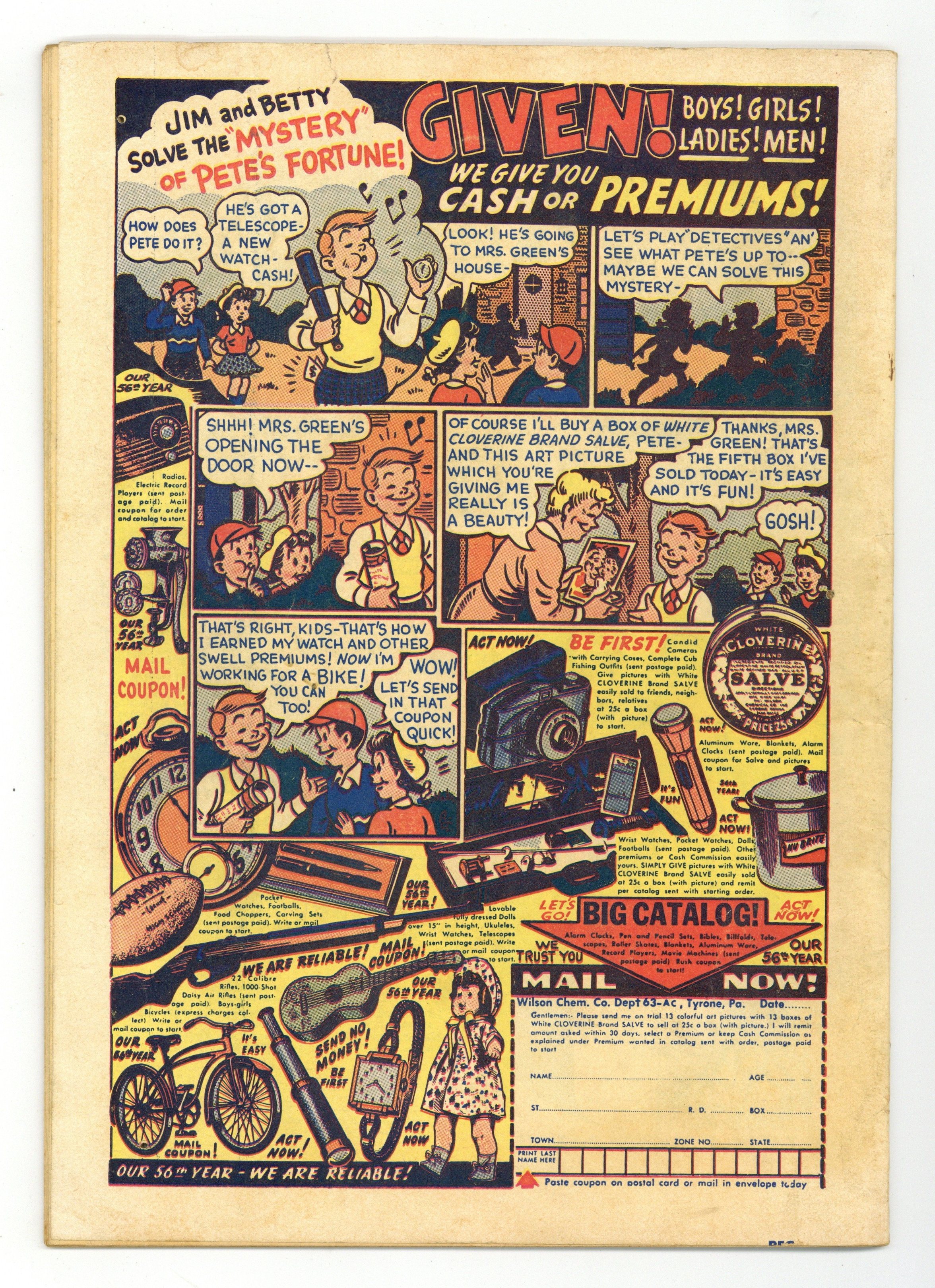 Tale of the Treacherous Twin starring Boom Boom Brannigan. Trouble Starts Right Here starring Frankenstein, script and art by Dick Briefer. Ted O'Neil and Hinky Captured, art by Arnold Hicks. Pink Pig Restaurant starring Worldbeater and Unghh, script by Fred Morgan, art by August Froehlich. Deadly Doubles starring Yank & Doodle & Black Owl. $0.10. Cover price $0.10.