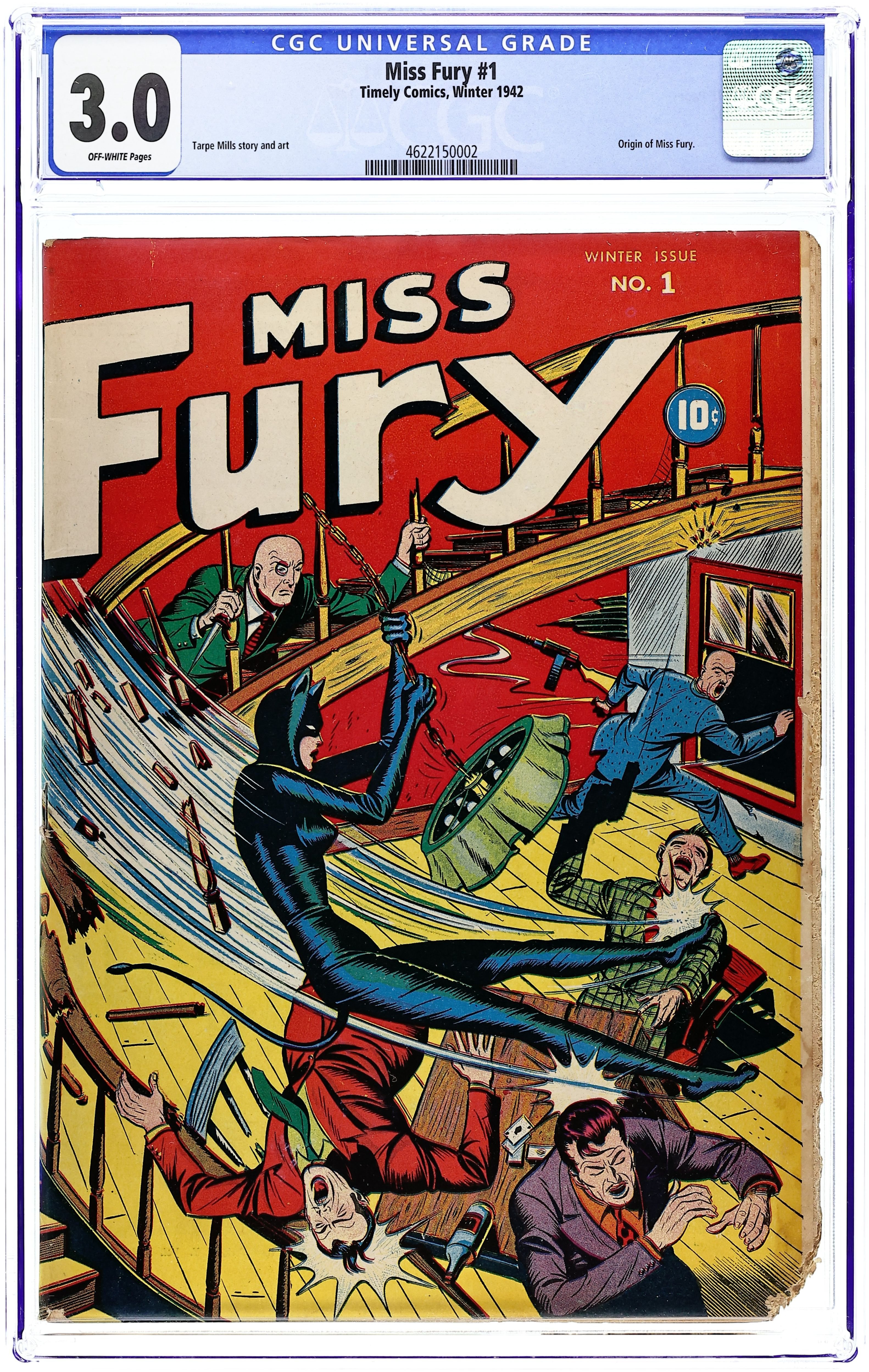 Reprint strips. Edited by Stan Lee. Story and Art by Tarpé Mills. Cover by Alex Schomburg. Includes the origin of Miss Fury [Marla Drake]. Featuring untitled reprints of Black Fury Sunday strips (the Miss Fury strip was called Black Fury at its start in 1941). 64 pages, full color. Cover price $0.10.