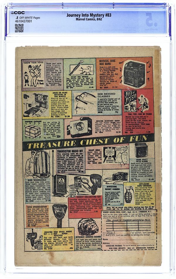 Ends Jan 14 9:09 PM CST Bid History 3 bids Current Bid $116 Your Secret Max Bid If you'd like to bid, please log in or register. Cover pencils by Jack Kirby, inks by Sol Brodsky. "The Master Plan of Mr. Hyde!", script by Stan Lee, art by Don Heck; Mister Hyde kidnaps Don Blake and Jane Foster and then tries to steal a submarine using Jane as a hostage; Jane stops Thor from catching Hyde because she thinks that Don is still in danger; The police realize that Hyde framed Thor for the bank robbery, but Jane's actions convince Odin that she is unworthy of immortality. "Tricky Travel" text story. "The Unreal!", script by Stan Lee (plot) and Larry Lieber (script), pencils by Larry Lieber, inks by Matt Fox; A man recounts a dream to a psychiatrist, in which he meets and fights an alien on an expedition; The psychiatrist dismisses the importance of the dream, since the alien "human" that he describes couldn't exist. Fourth "Tales of Asgard" installment, "The Storm Giants!", script by Lee, pencils by Jack Kirby, inks by Paul Reinman; This is the first "Boyhood of Thor" story; Thor and Loki (as children) defeat three Storm Giants and return the Golden Apples of Iduna. 36 pgs., full color. Cover price $0.12.