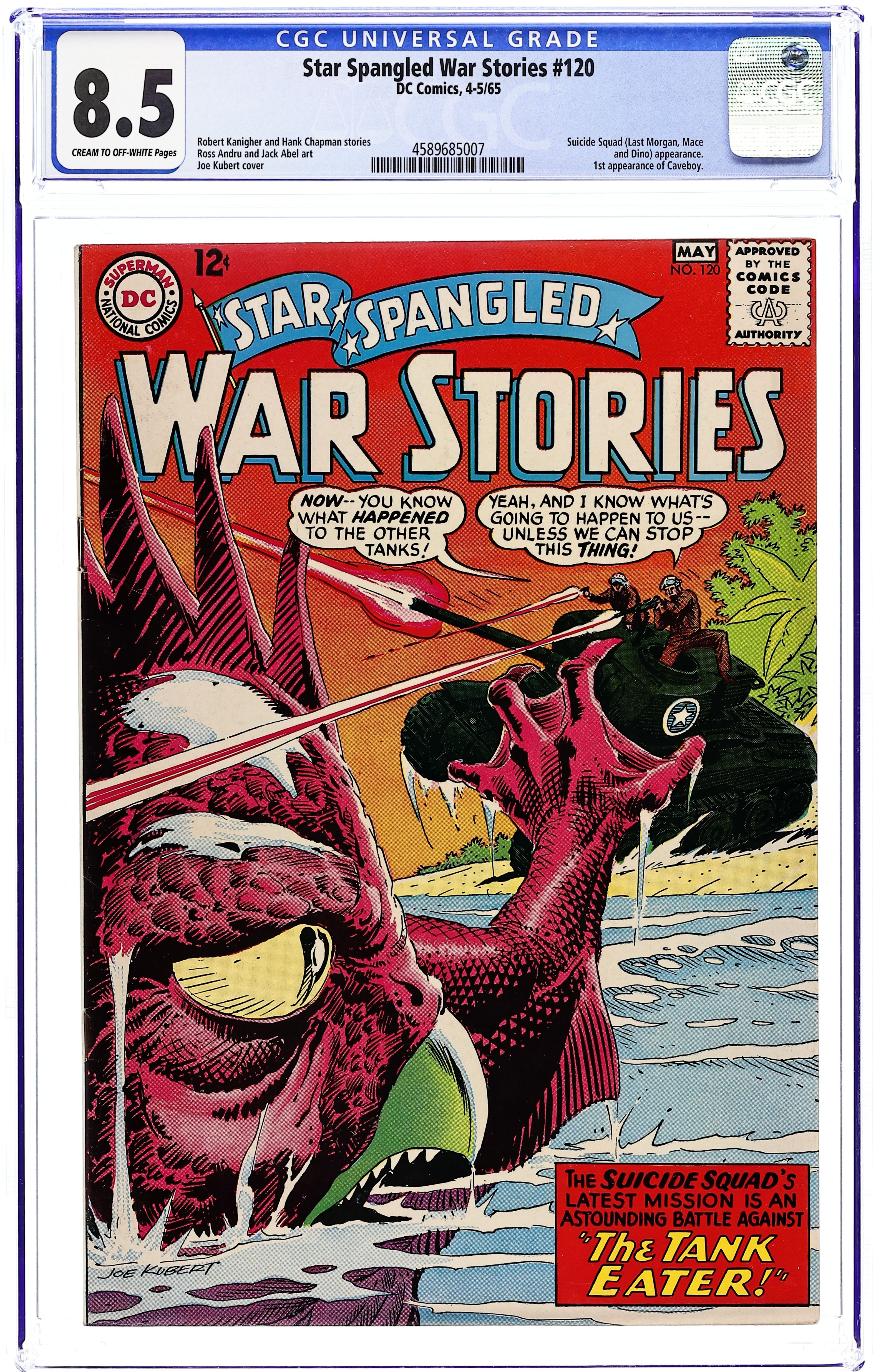 Cover art by Joe Kubert. The Tank Eater featuring Suicide Squad (Morgan, Mace, Dino, and Caveboy), script by Robert Kanigher, pencils by Ross Andru, inks by Mike Esposito. Dryland PT Boat, script by Hank Chapman, art by Jack Abel. American Military Ornaments filler page, script and pencils by Morris Waldinger, inks by Tom Nicolisi. Air Force Mottoes half-page filler, script by Julius Schwartz, pencils by Morris Waldinger, inks by Tom Nicolosi. 36 Pages, Full Color. Cover price $0.12.