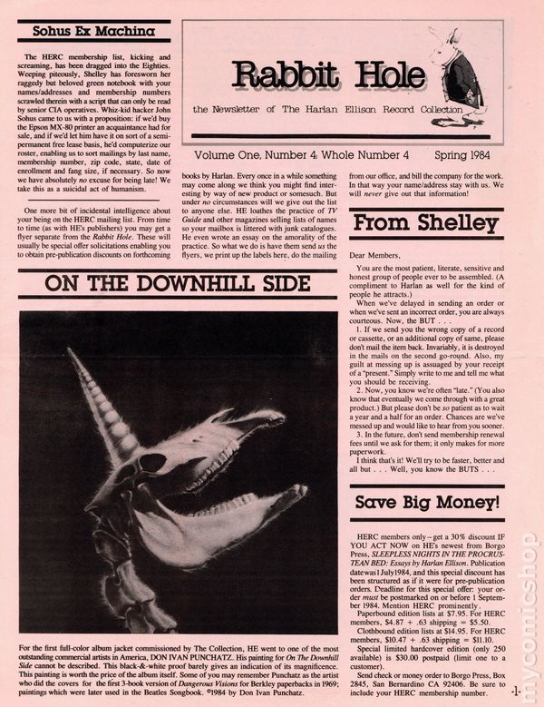 View scansVol. 1, No. 4 - Whole Number 4. Spring 1984. Newsletter of The Harlan Ellison Record Collection. Originally created as a means to promote Harlan's audio recordings to his fans, it also gave him the opportunity to sell books from his back list, offer updates on projects, the occasional essay, scheduled appearances, publication schedules, and Harlan's ever present opinions on...everything. Is there consistency through the issues? Only in that they offer a relaxed review of All Things Ellison. 8.5" x 11", 6 pages, B&W