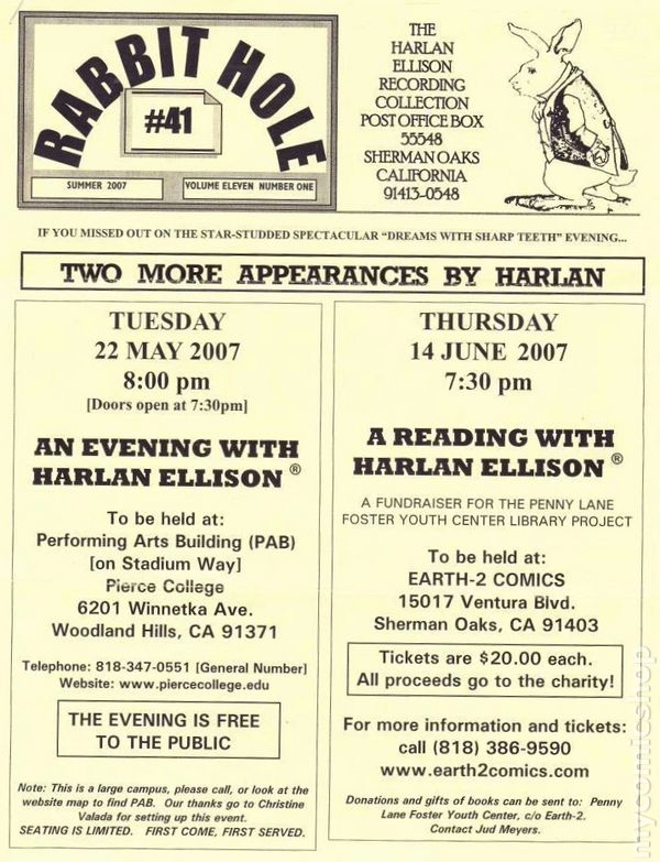 Vol. 11, No. 1 - Whole Number 41. Summer 2007. Newsletter of The Harlan Ellison Record Collection. Originally created as a means to promote Harlan's audio recordings to his fans, it also gave him the opportunity to sell books from his back list, offer updates on projects, the occasional essay, scheduled appearances, publication schedules, and Harlan's ever present opinions on...everything. Is there consistency through the issues? Only in that they offer a relaxed review of All Things Ellison. 8.5" x 11", 6 pages, B&W Cover price $3.50.