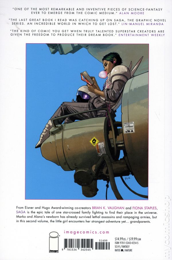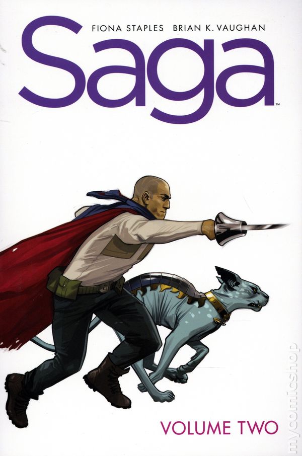 Volume 2 - 1st printing. Collects Saga (2012 Image) #7-12. Written by Brian K. Vaughan. Art and Cover by Fiona Staples. The critically acclaimed masterpiece and one of the most iconic, bestselling comic book series of its time continues in the second volume, now presented in a smaller, digest size featuring all new cover art by FIONA STAPLES. Thanks to her star-crossed parents Marko and Alana, newborn baby Hazel has already survived lethal assassins, rampaging armies, and alien monstrosities, but in the cold vastness of outer space, the little girl encounters something truly frightening: her grandparents! A genre-blending, sci-fi/fantasy space opera about star-crossed lovers from enemy worlds. An epic romantasy featuring a diverse and eclectic cast of memorable characters, SAGA follows new parents Marko and Alana as they risk everything to raise their child amidst a never-ending galactic war. Softcover, 6-in. x 9-in., 152 pages, full color. Mature Readers NOTE: "The kind of comic you get when truly talented superstar creators are given the freedom to produce their dream comic." —Entertainment Weekly Cover price $14.99.