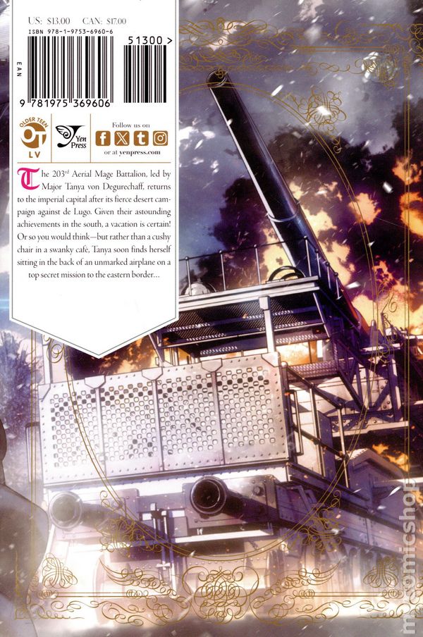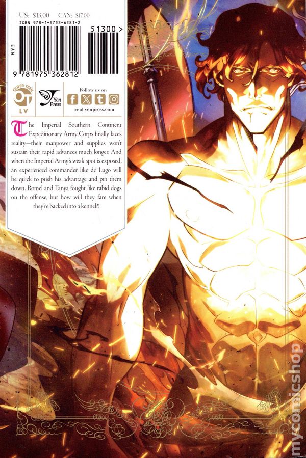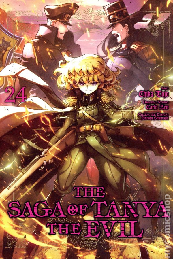 Volume 24 - 1st printing. Written by Carlo Zen. Art and Cover by Chika Tojo. Character design by Shinobu Shinotsuki. Translated by Richard Tobin. The Imperial Southern Continent Expeditionary Army Corps struggles under the reality of the shortage of manpower and supplies. The Imperial army's weak spot has been exposed, and an experienced commander like de Lugo is quick to take advantage and pin them down. Driven into a corner, will Romel and Tanya be able to turn the desperate situation around!? Softcover, 5-in. x 7-in., 216 pages, B&W. Older Teen Cover price $13.00.