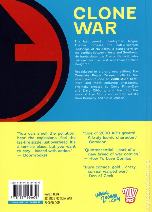 Volume 1 - 1st printing. Written by Gerry Finley-Day and Alan Moore. Art by Dave Gibbons, Cam Kennedy, Mike Dorey, Brett Ewins, and Colin Wilson. Cover by Dave Gibbons. A brand-new, updated edition repackaging the complete adventures of Rogue Trooper, originally created by Gerry Finley-Day and Dave Gibbons, ideal for new readers and collectors ahead of the upcoming film by Duncan Jones. The last genetic infantryman, crossing a landscape scarred by the raging war between Norts and Southers, Rogue Trooper hunts down the Traitor General, who betrayed his men and caused their slaughter. Repackaged in a brand new edition, The Complete Rogue Trooper collects the adventures of one of 2000 ADs best-loved and most enduring characters, originally created by Gerry Finley-Day and Dave Gibbons, and featuring the work of Alan Moore and veteran artists Cam Kennedy and Colin Wilson. Softcover, 7 1/2-in. x 10 1/2-in., 368 pages, B&W. Teen Cover price $32.99.