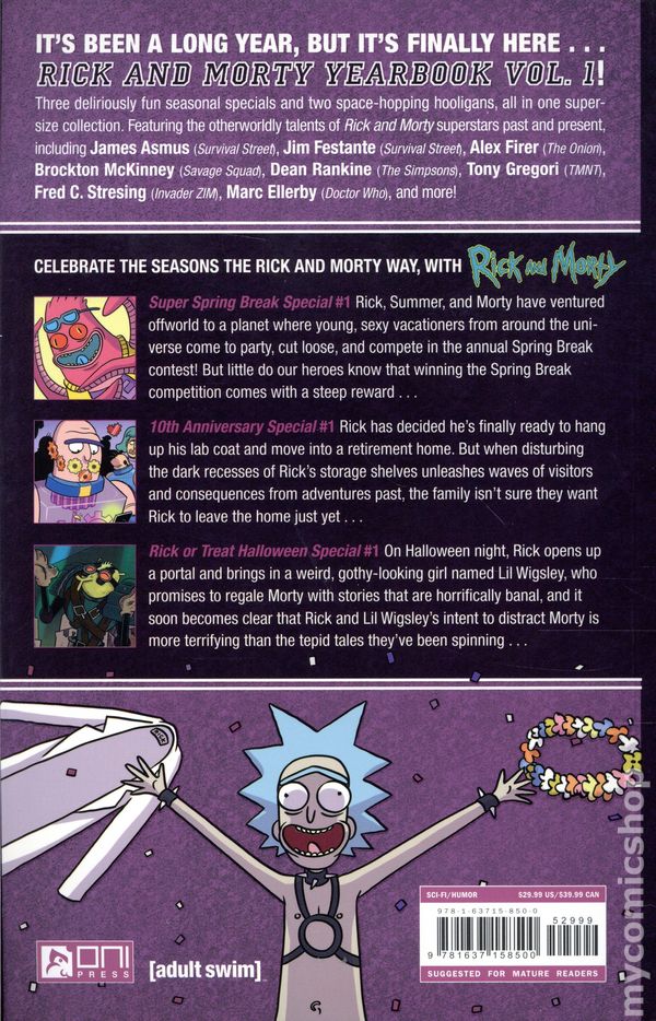Volume 1 - 1st printing. Collects Rick and Morty: Super Spring Break Special (2024 Oni Press), Rick and Morty 10th Anniversary Special (2024 Oni Press), and Rick and Morty: Rick or Treat Halloween Special (2024 Oni Press). Written by James Asmus, Jim Festante, Alex Firer, and Brockton McKinney. Art and cover by Dean Rankine, Tony Gregori, Angela Trizzino, Fred C. Stresing, and Marc Ellerby. It's been a long year, but its finally here . . . its Rick and Morty Yearbook Vol. 1! Three deliriously fun seasonal specials and two space-hopping hooligans, all in one super-size collection. Featuring the otherworldly talents of Rick and Morty superstars past and present, including James Asmus (Survival Street), Jim Festante (Survival Street), Alex Firer (The Onion), Brockton McKinney (Savage Squad), Dean Rankine (The Simpsons), Tony Gregori (TMNT), Fred C. Stresing (Invader ZIM), Marc Ellerby (Doctor Who), and more! Celebrate the seasons the Rick and Morty way. Softcover, 200 pages, full color. Mature Readers Cover price $29.99.