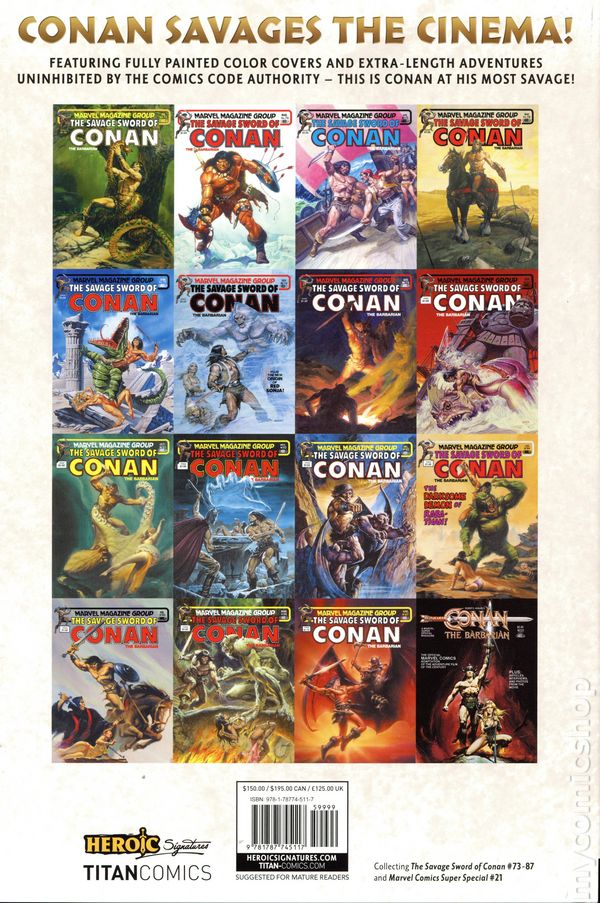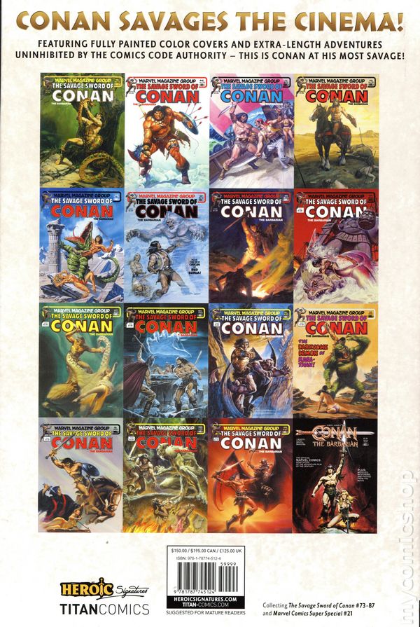 Volume 6 - 1st printing. Collects Savage Sword of Conan (1974-1995) #73-87 and Marvel Comics Super Special (1977-1986) #21. Based on the stories and characters created by Robert E. Howard. Written by Michael Fleisher, Roy Thomas, Chris Claremont, Steve Grant, John Buscema, Bruce Jones, David Anthony Kraft, Alan Zelenetz, and Ernie Chan. Art by John Buscema, Val Mayerik, Alfredo Alcala, Pablo Marcos, Joe Chiodo, Carl Potts, Bill Sienkiewicz, Ernie Chan, Jeff Easley, John Totleben, Barry Windsor-Smith, Armando Gil, Alan Kupperberg, Alex Toth, Tim Conrad, Michael Golden, Gil Kane, Greg LaRocque, Mary Wilshire, Luke McDonnell, Danny Bulanadi, Ricardo Villamonte, Bill Anderson, Nestor Redondo, and Zoran Vanjaka. Cover by Joe Chiodo. Over 1000 pages of savage action! X-MEN superstar Chris Claremont pens an adventure that pits Conan against the minions of Thoth-Amon in a tour de force drawn by Val Mayerik and Conan legend Roy Thomas is also on hand to tell solo stories of Conans Red Nails colleague, Valeria. Also includes extensive articles on, and the comic book adaptation of, the blockbuster Conan the Barbarian film! Hardcover, 8 1/2-in. x 11-in., 1,008 pages, B&W. Mature Readers Cover price $150.00.
