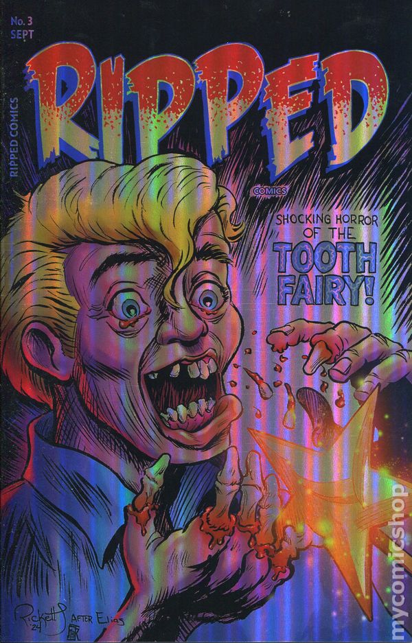 Foil Edition "A" Cover by Steve Ricketts. Written by Steve Ricketts. Art by Steve Ricketts. Coloring by Federico Pepto Sioc Jr. After failing to stop the "Whatever Bitches" in RIPPED #2, our hero trained, focused, and... leveled up his gas. In Ripped #3, he discovers he can fly thanks to his Unique digestive gift and meets the mysterious swamp sorceress, Trixie LaCroix-aka the Tooth Fairy, whos packing a magical wand the size of a canoe paddle. The world of Uniques just got weirder! 32pgs. FC Cover price $15.00.