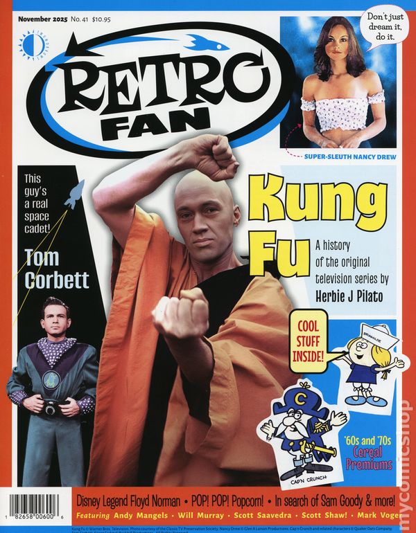 (W) Ed Catto (A) Various (CA) Various RetroFan #41 kicks off with TVs original Kung Fu starring David Carradine, a Nancy Drew history, Disney animator Floyd Norman, Tom Corbett: Space Cadet, collectible 60s and 70s cereal premiums, in search of Sam Goody, and more! Featuring columns and contributions by Herbie J Pilato, Andy Mangels, Will Murray, Scott Saavedra, Scott Shaw, and Mark Voger. Edited by Ed Catto. 84 pages, full color, not rated. Cover price $10.95.